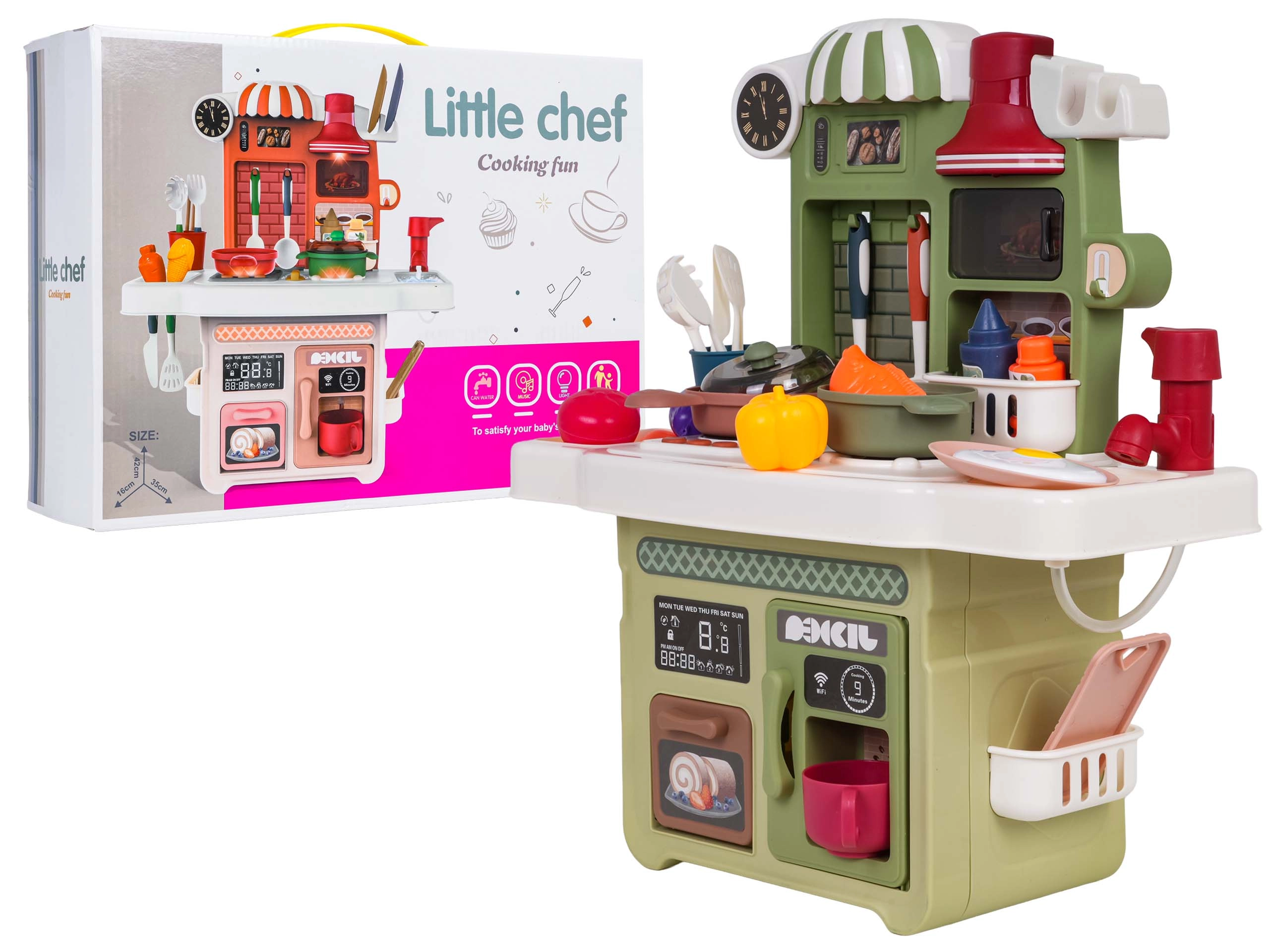 Apšviesti degikliai su virimo ir kepimo garsais paverčia kiekvieną receptą nuotykiu. Paspaudus mygtukus, vaikai taip pat išgirs daineles, skaičiuotes ir saugos nurodymus.
