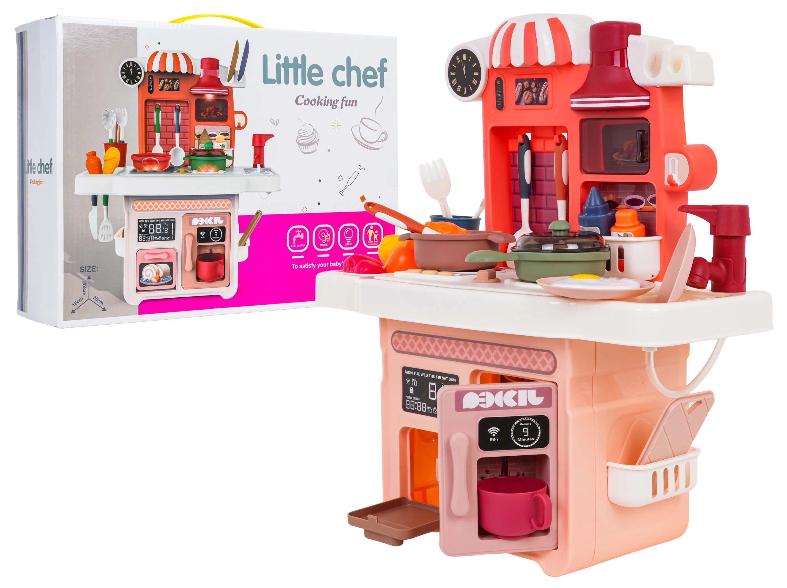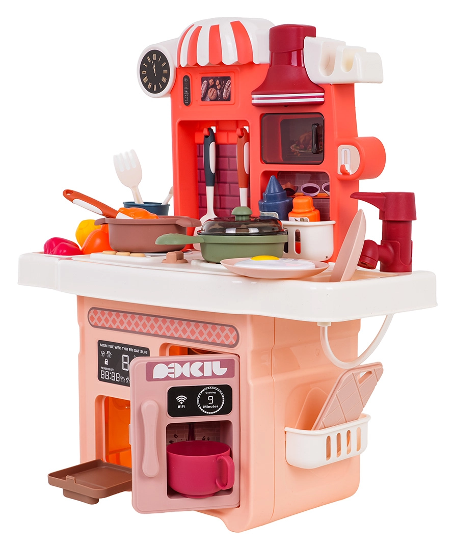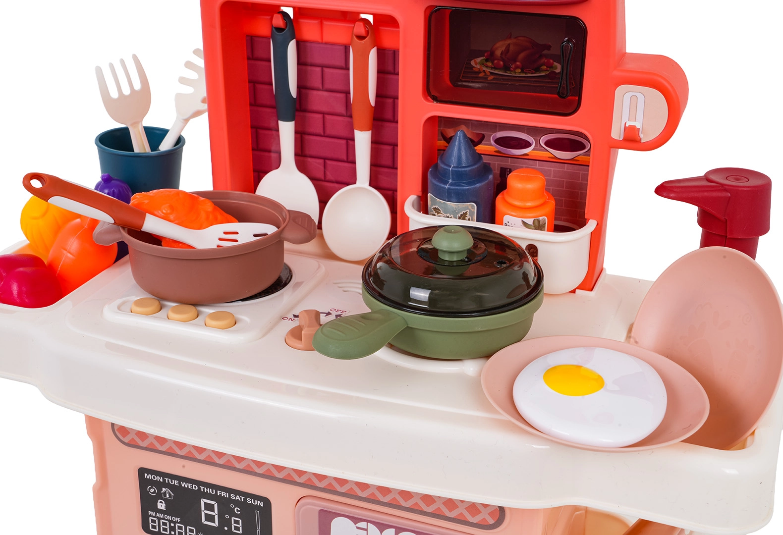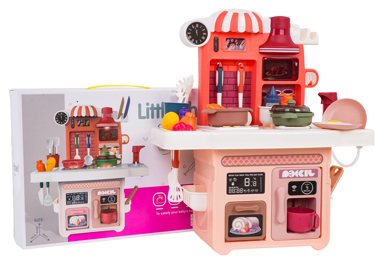 Pagrindinė atrakcija – veikiantis čiaupas: iš baterijomis maitinamo siurblio vanduo teka į kriauklę, tad vaikai gali „plauti indus“ tarsi tikroje virtuvėje. Taip pat yra atidaroma orkaitė, kavos aparato imitacija ir apšviestas gartraukis. Gausūs priedai (puodai, keptuvė, įrankiai, lėkštutės ir maisto produktai) praplečia žaidimo galimybes.