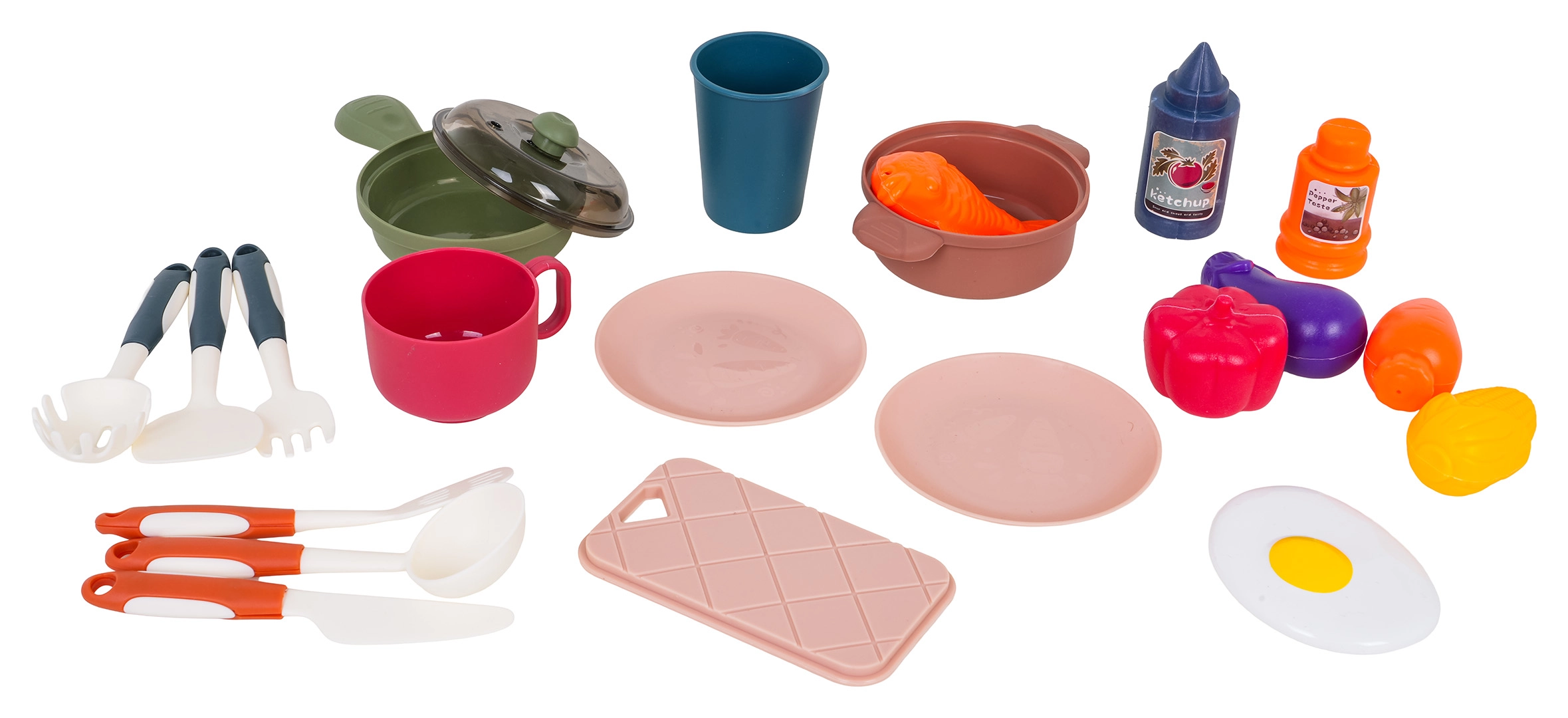 Keptuvė, puodas su dangčiu, lėkštutės, puodeliai, virtuvės įrankiai ir įvairūs maisto produktai (žuvis, daržovės, kiaušinis) skatina kūrybiškumą ir socialinius įgūdžius.