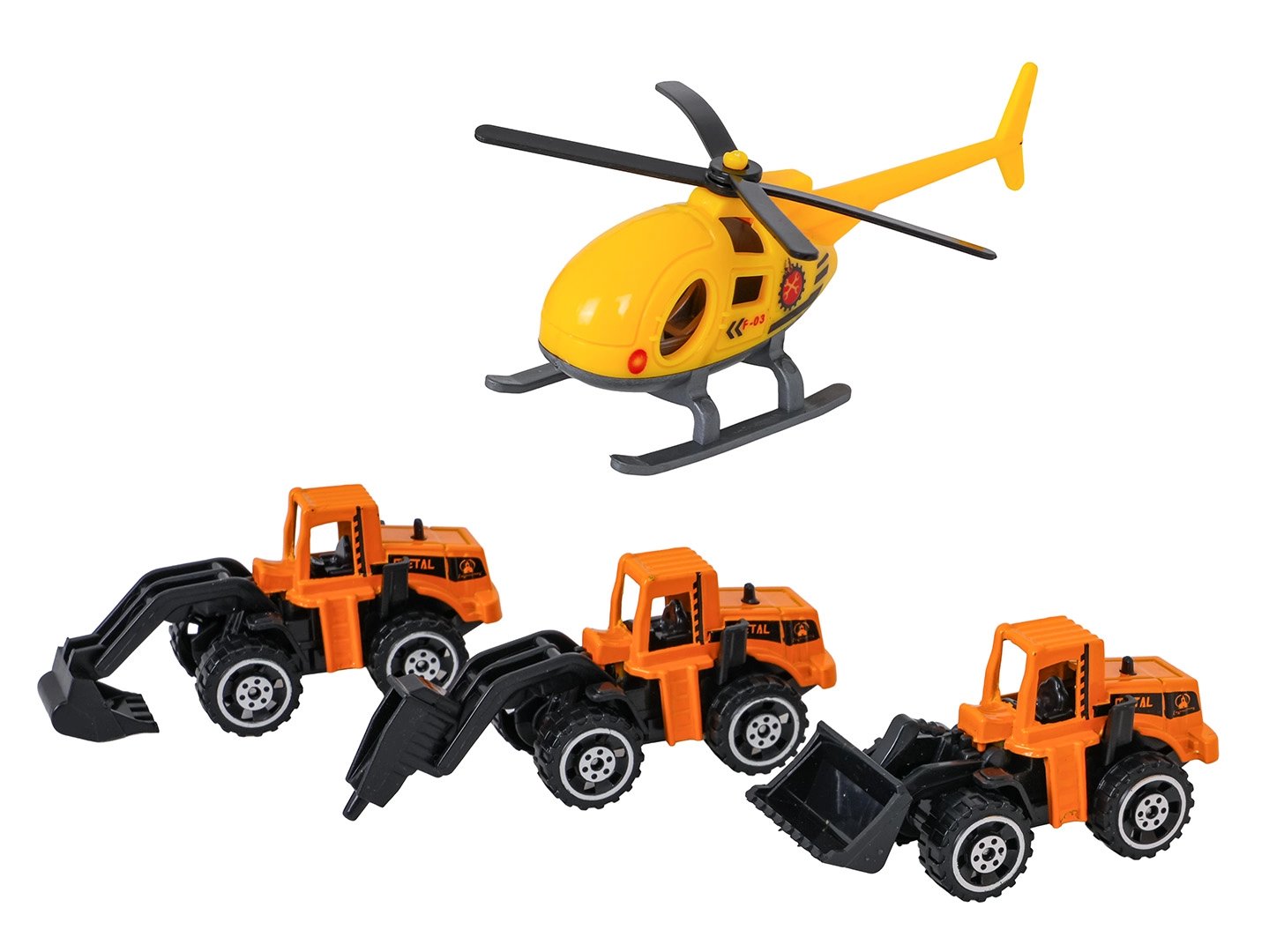 3 metaliniai statybiniai automobiliai ir sraigtasparnis