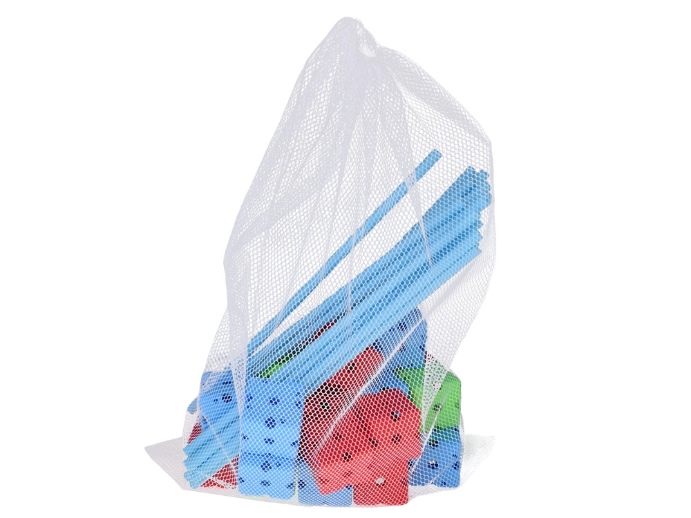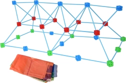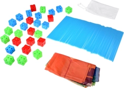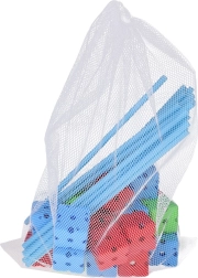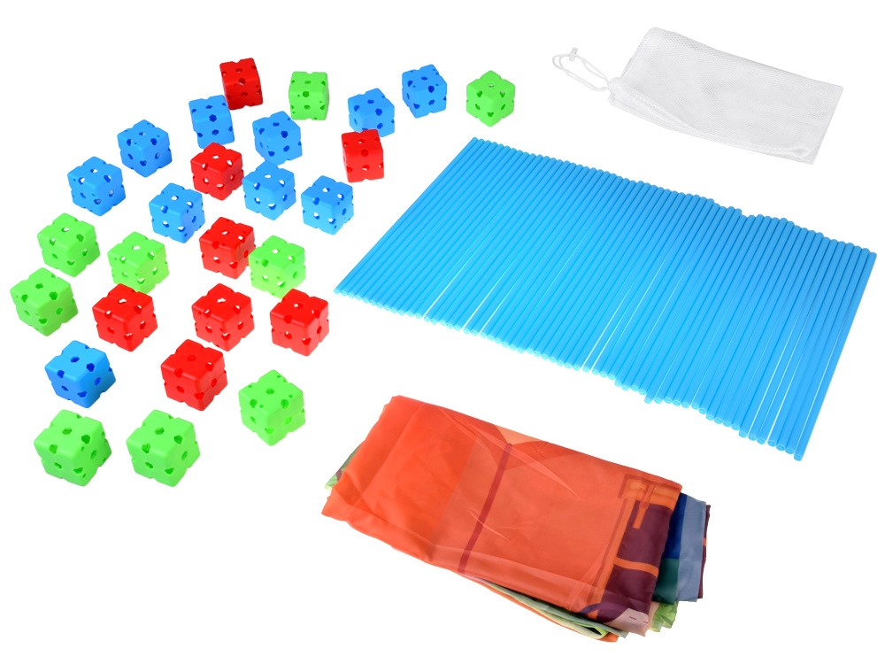 - 58× lazdelė (apie 38 cm ilgis, apie 1 cm skersmuo), 29× jungimo kaladėlė (apie 5 × 5 × 5 cm), 1× tekstilinė danga su spauda (apie 230 × 155 cm), 1× tinklinis laikymo maišelis