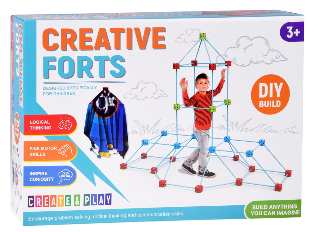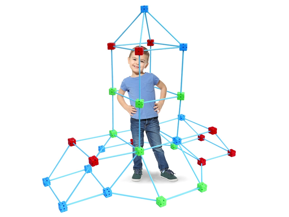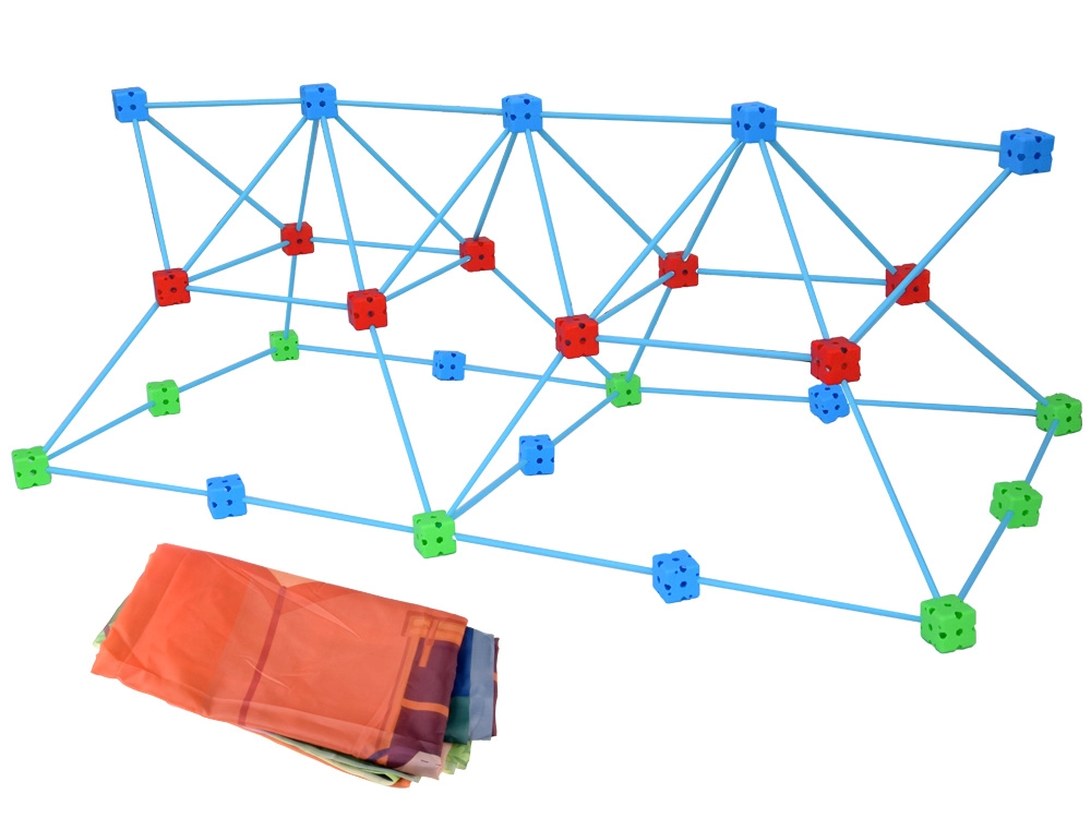 Atraskite begalinį smagumą su šiuo didelio dydžio konstrukcinių šiaudelių ir kaladėlių rinkiniu! Vaikai lengvai pastatys fortą, namelį, bokštą, iglu ar slaptą bazę. Ypač lengvos lazdelės ir tvirti daugiaangiai jungtukai užtikrina stabilias konstrukcijas, o spausdintu raštu dengiamas audinys paverčia rėmą jaukia palapine; tinklinis maišelis palengvina laikymą. Idealu kūrybiškumui, erdviniam mąstymui ir smulkiajai motorikai lavinti.
