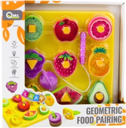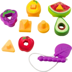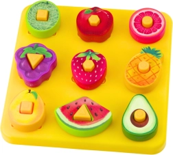 Ši edukacinė vaisių motyvo dėlionė jungia pramogą ir mokymąsi. Ant 20 × 20 cm pagrindo vaikai dėlioja spalvingus geometrinių formų elementus į atitinkamas angas, taip natūraliai įsisavindami spalvų, formų ir vaisių pažinimą. Rinkinyje yra ir „kirmėlaitė“ vėrimui, kuri dar labiau skatina smulkiąją motoriką ir susikaupimą.