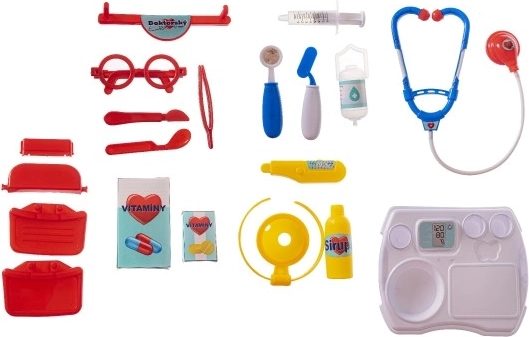 - Plastikinis gydytojo rinkinys su įvairiais įrankiais (pvz., stetoskopas, švirkštas, termometras, akiniai, vaistų buteliukai)