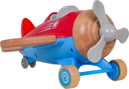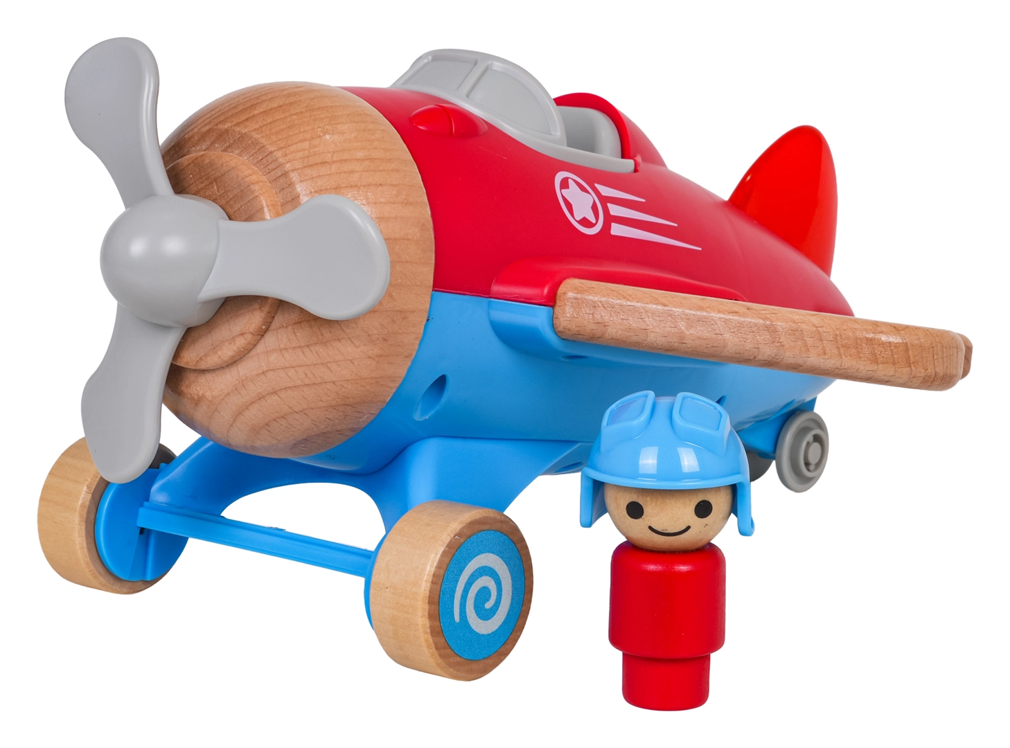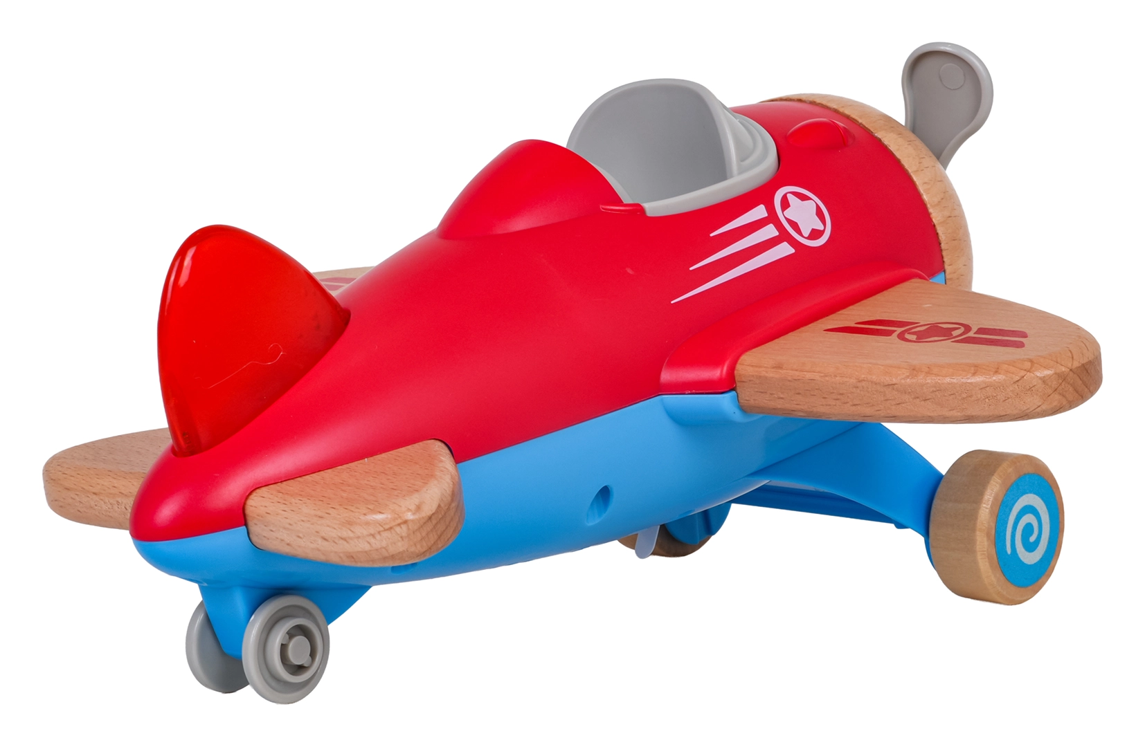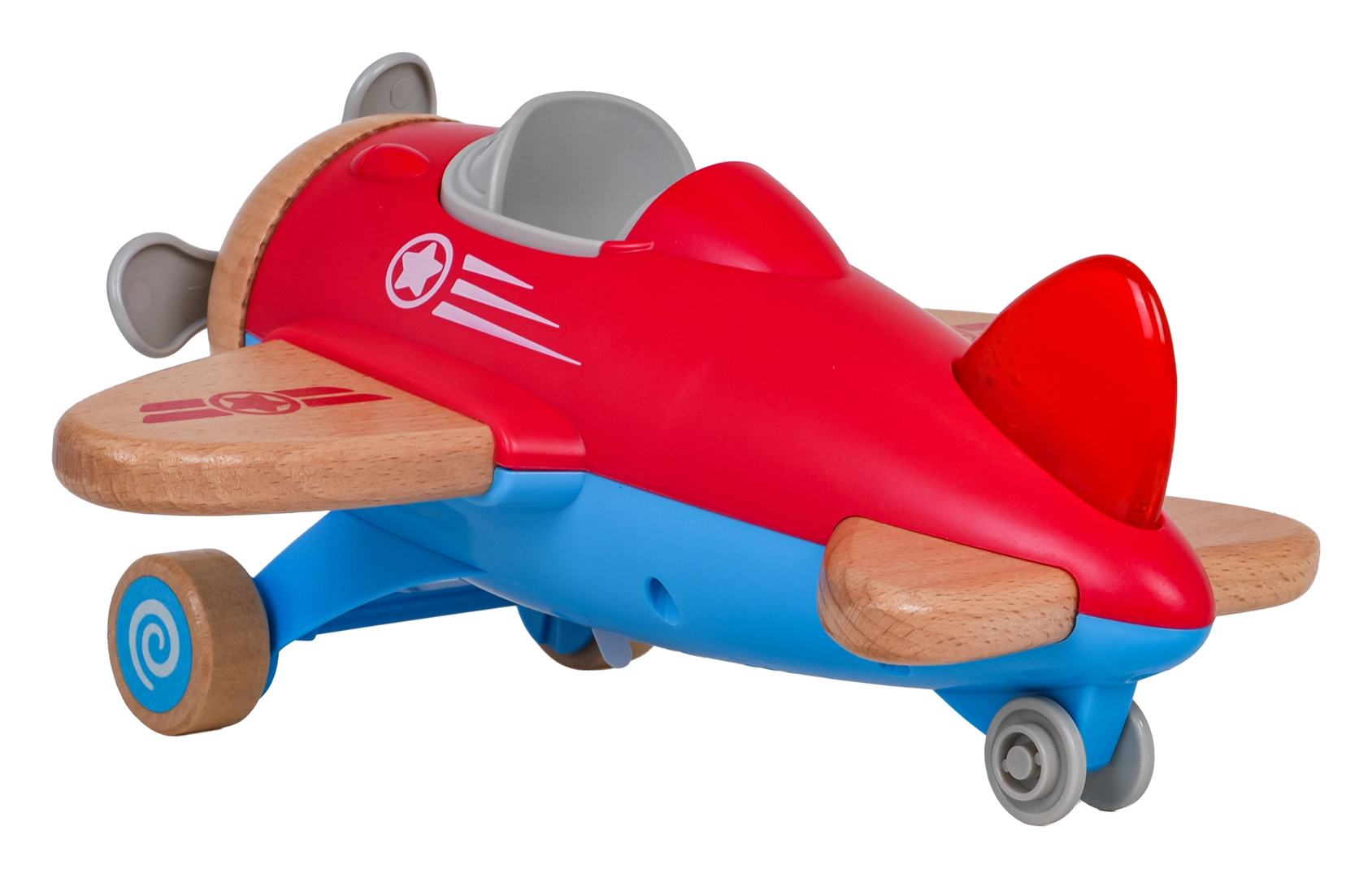Spalvingas medinis lėktuvas mažiausiems nuo 18 mėnesių siūlo šviesos ir garso efektus, besisukančią propelerį ir judančius ratukus. Medžio ir kokybiško plastiko derinys užtikrina ilgaamžiškumą ir saugų žaidimą be aštrių briaunų. Paspaudus piloto figūrėlę, pasigirsta melodijos ir lėktuvo starto garsai, o galinis sparnas užsidega.