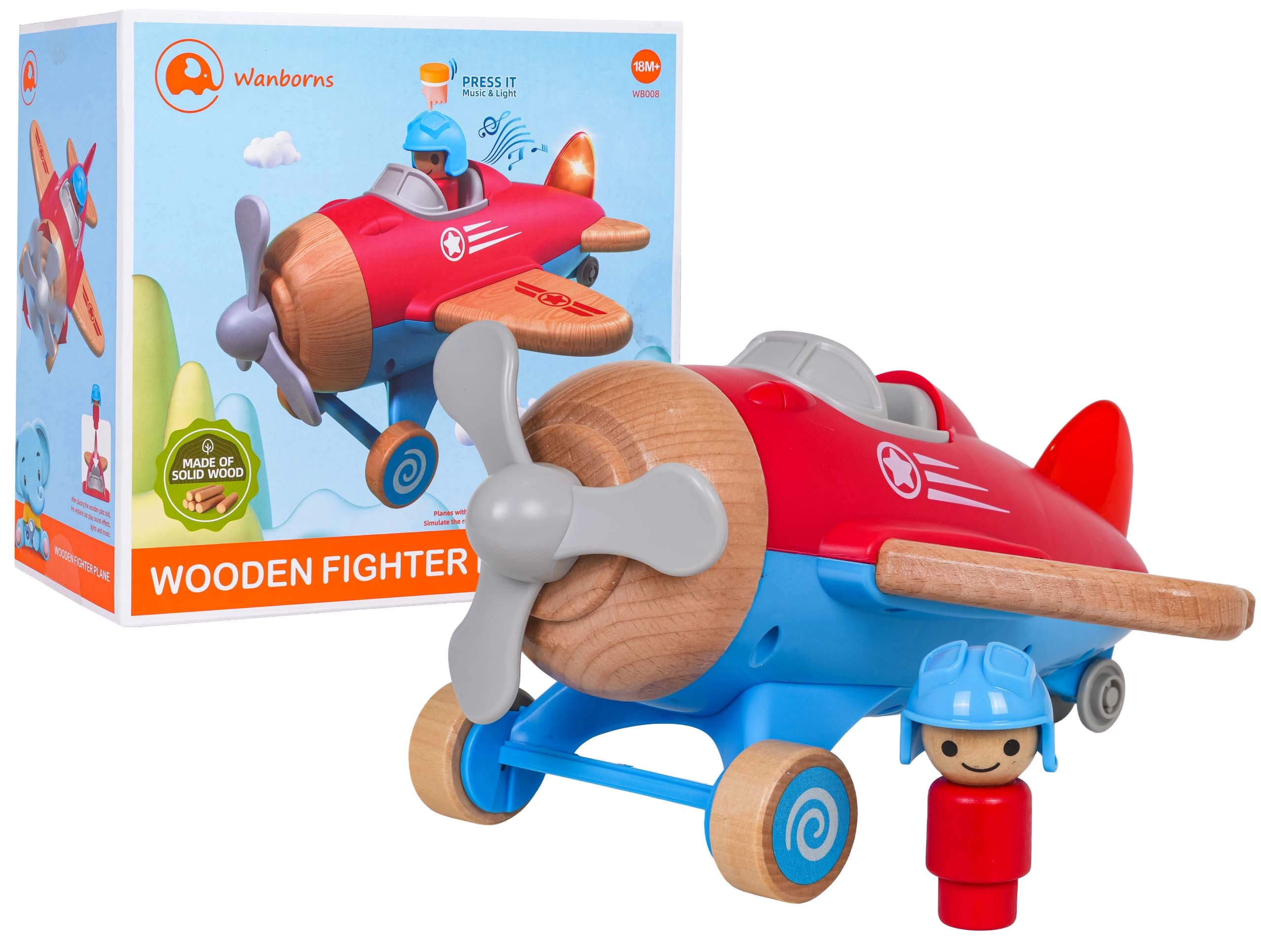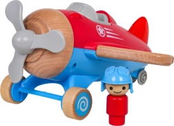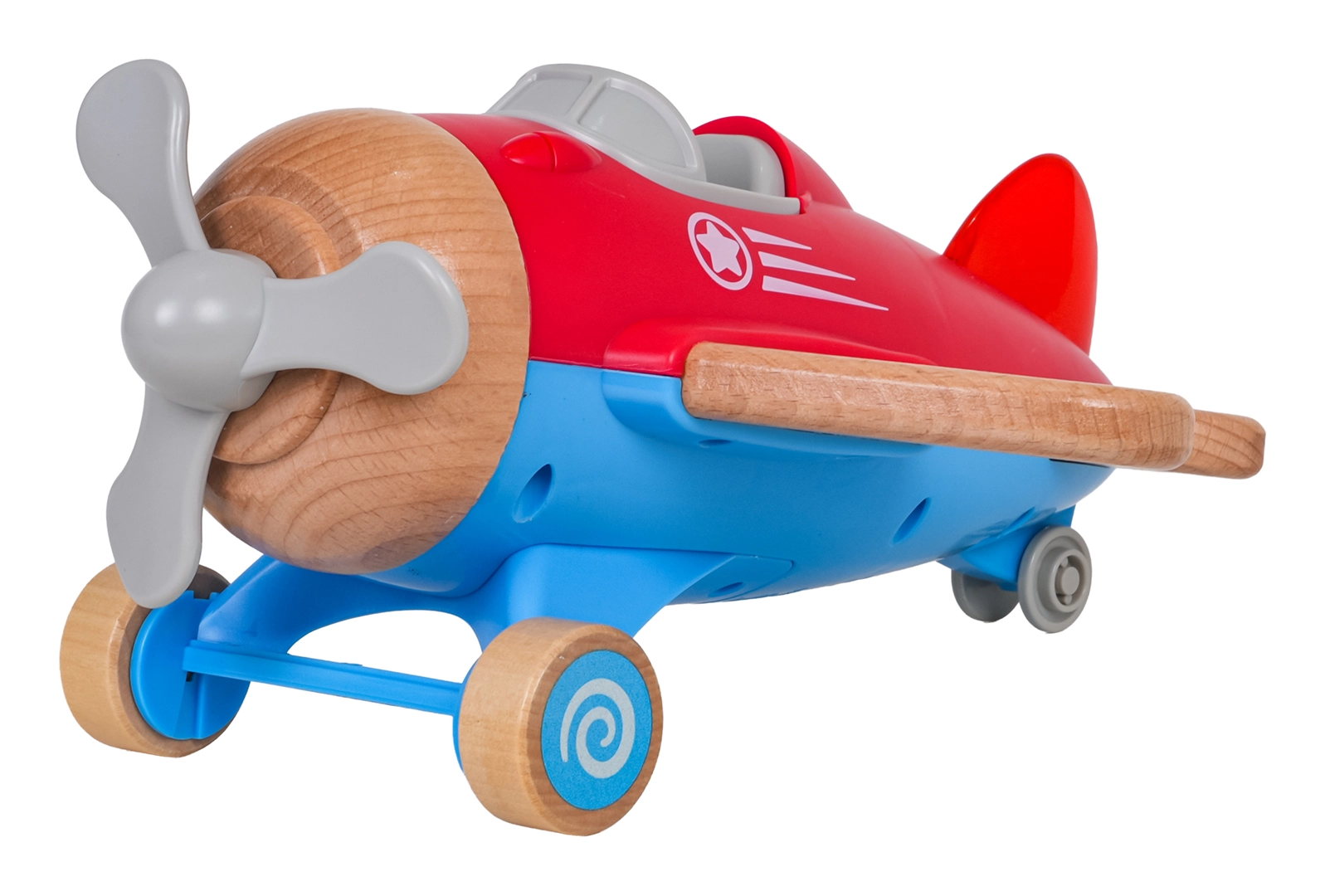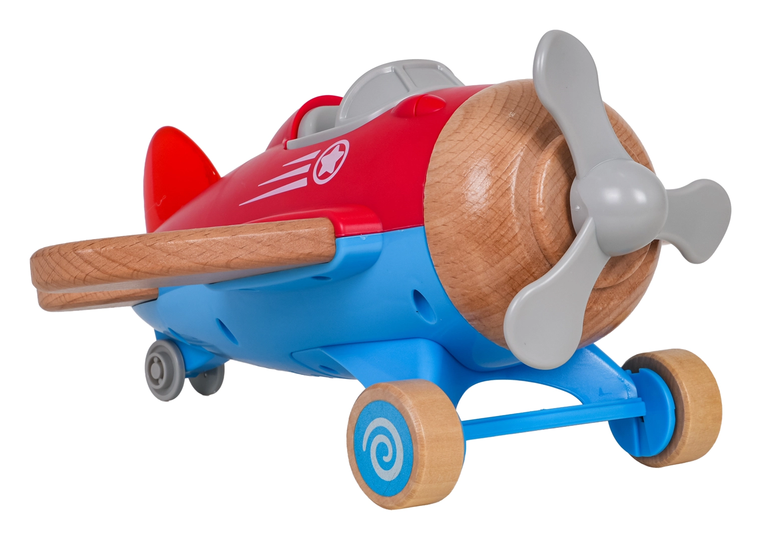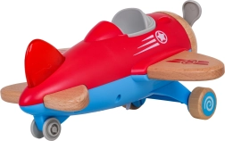 Spalvingas medinis lėktuvas mažiausiems nuo 18 mėnesių siūlo šviesos ir garso efektus, besisukančią propelerį ir judančius ratukus. Medžio ir kokybiško plastiko derinys užtikrina ilgaamžiškumą ir saugų žaidimą be aštrių briaunų. Paspaudus piloto figūrėlę, pasigirsta melodijos ir lėktuvo starto garsai, o galinis sparnas užsidega.