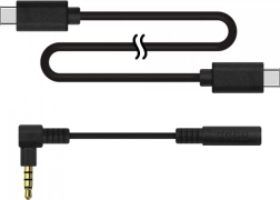 - Kameros modulis, pagrindas (stovas vamzdžio formos), USB‑C į USB‑C laidas, 3,5 mm stereo adapteris su dešiniu kampu