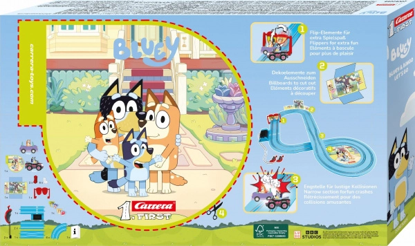 Leiskitės į lenktynių pasaulį su CARRERA First Bluey trasa – tai idealus pirmasis lenktynių rinkinys mažiesiems. 1:50 mastelio trasa siūlo dinamišką atkarpą su tiesiosiomis ir posūkiais, starto/finšo vartais ir gausia puošyba su mėgstamais personažais BLUEY ir BINGO. Dėl maitinimo baterijomis rinkinys puikiai tinka ir namams, ir kelionėms.