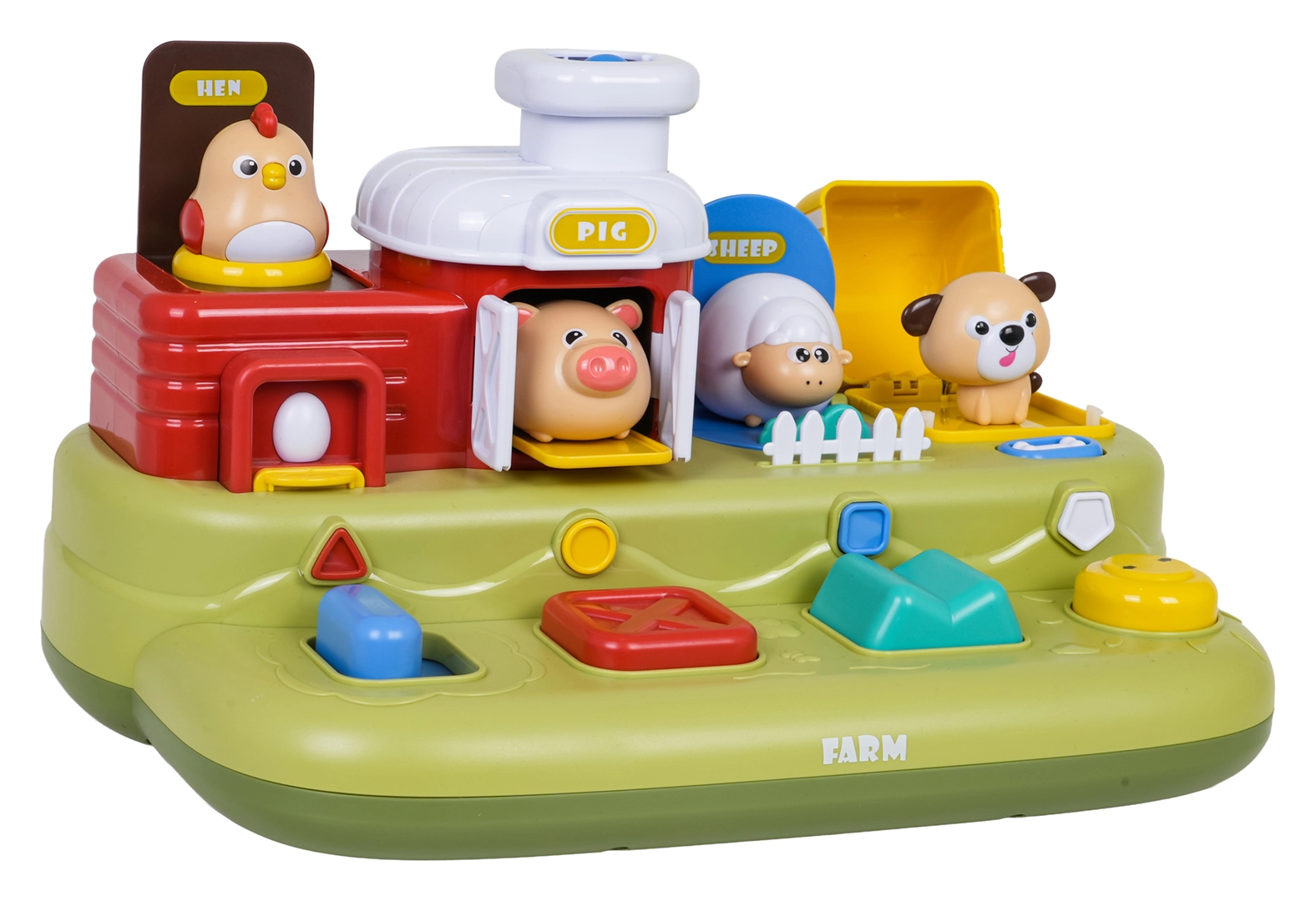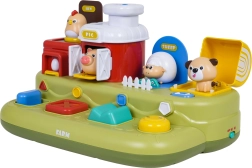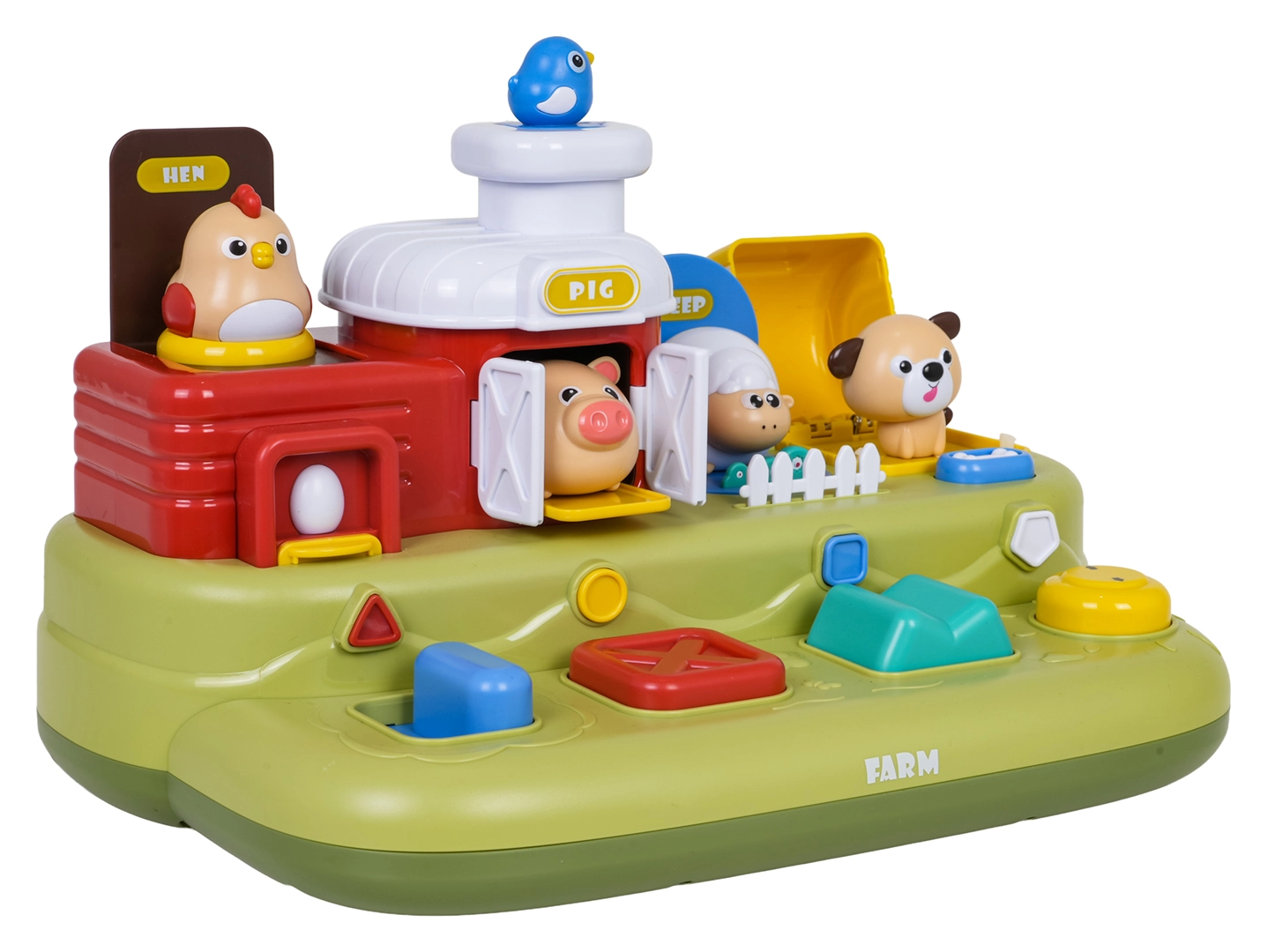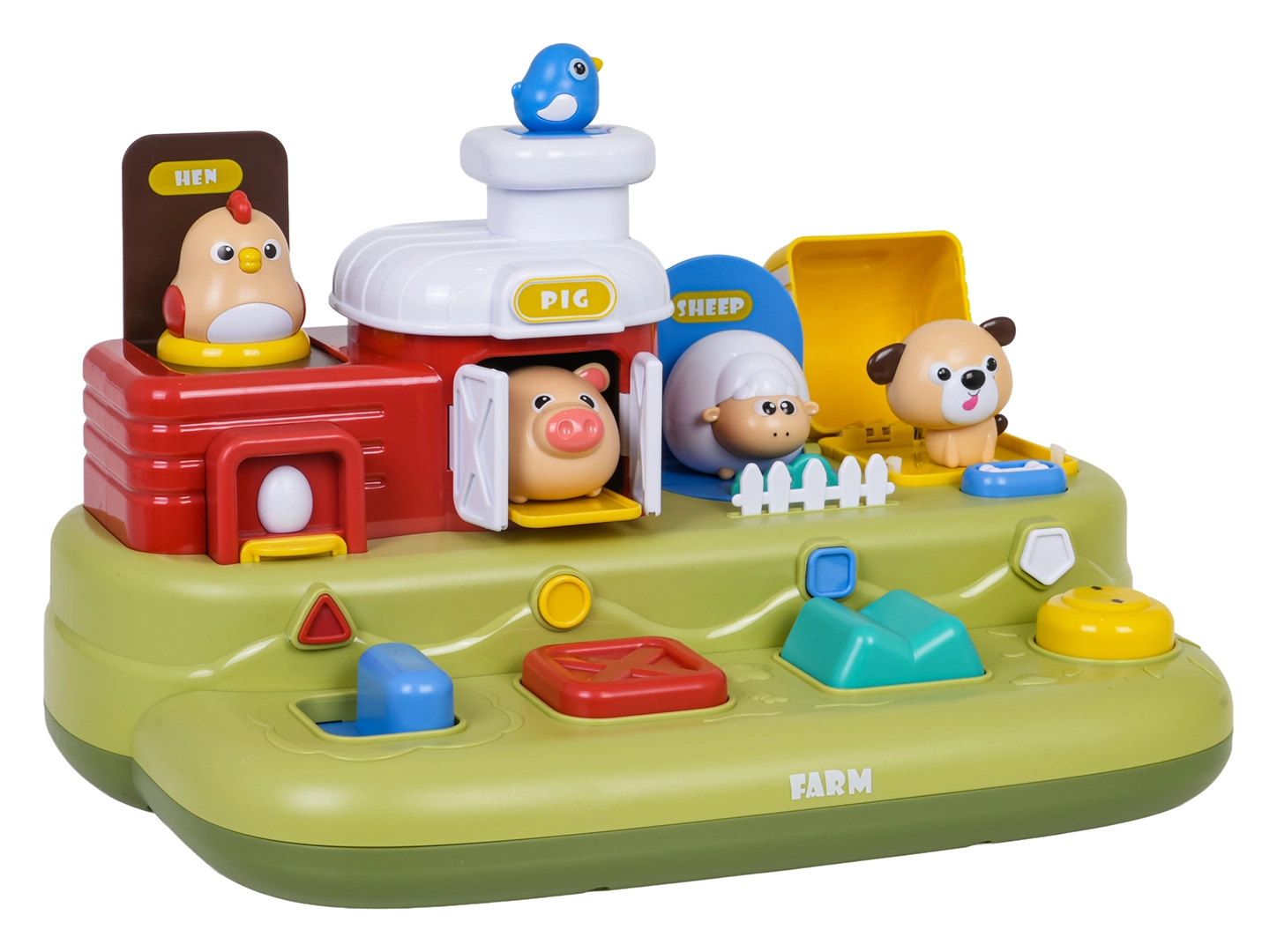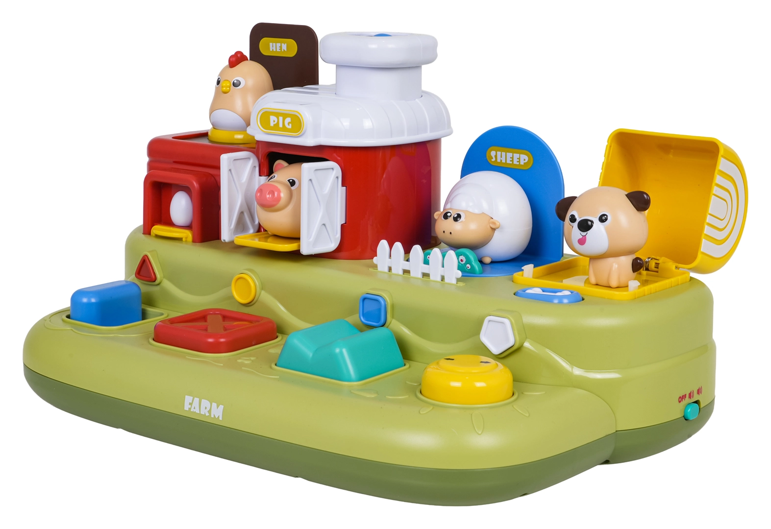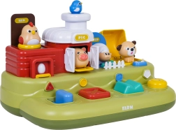 Ši linksma ferma suteikia vaikams daug atradimų: pastūmus mėlyną slankiklį iššoka viščiukas, paspaudus raudoną mygtuką atsidaro durelės su paršiuku, paspaudus žalią – pasirodo avytė, o pasukus geltoną valdiklį išlenda šuniukas. Virš valdiklių yra papildomi mygtukai, kurie įjungia melodijas, gyvūnėlių garsus ir kitus efektus.