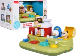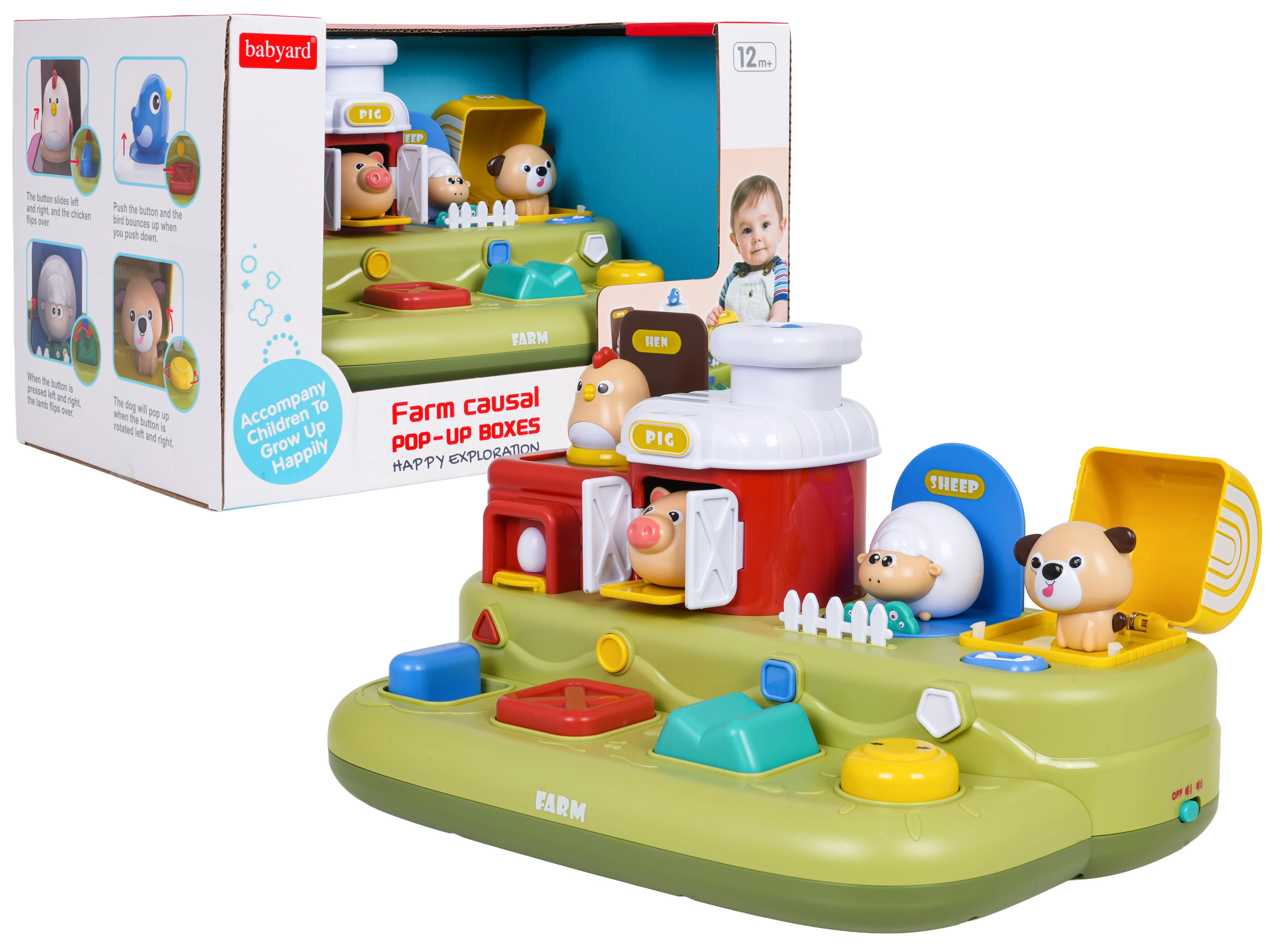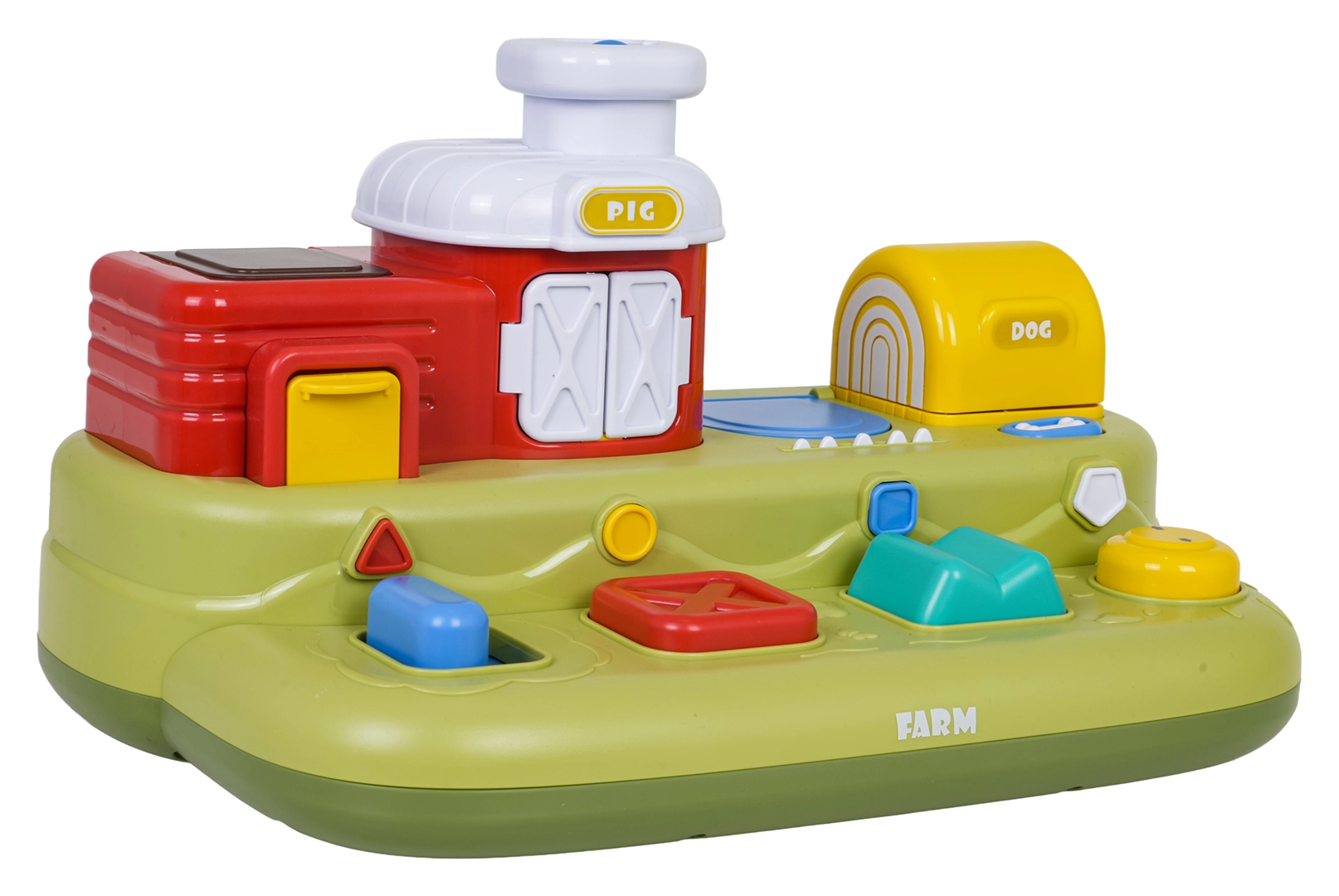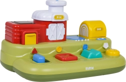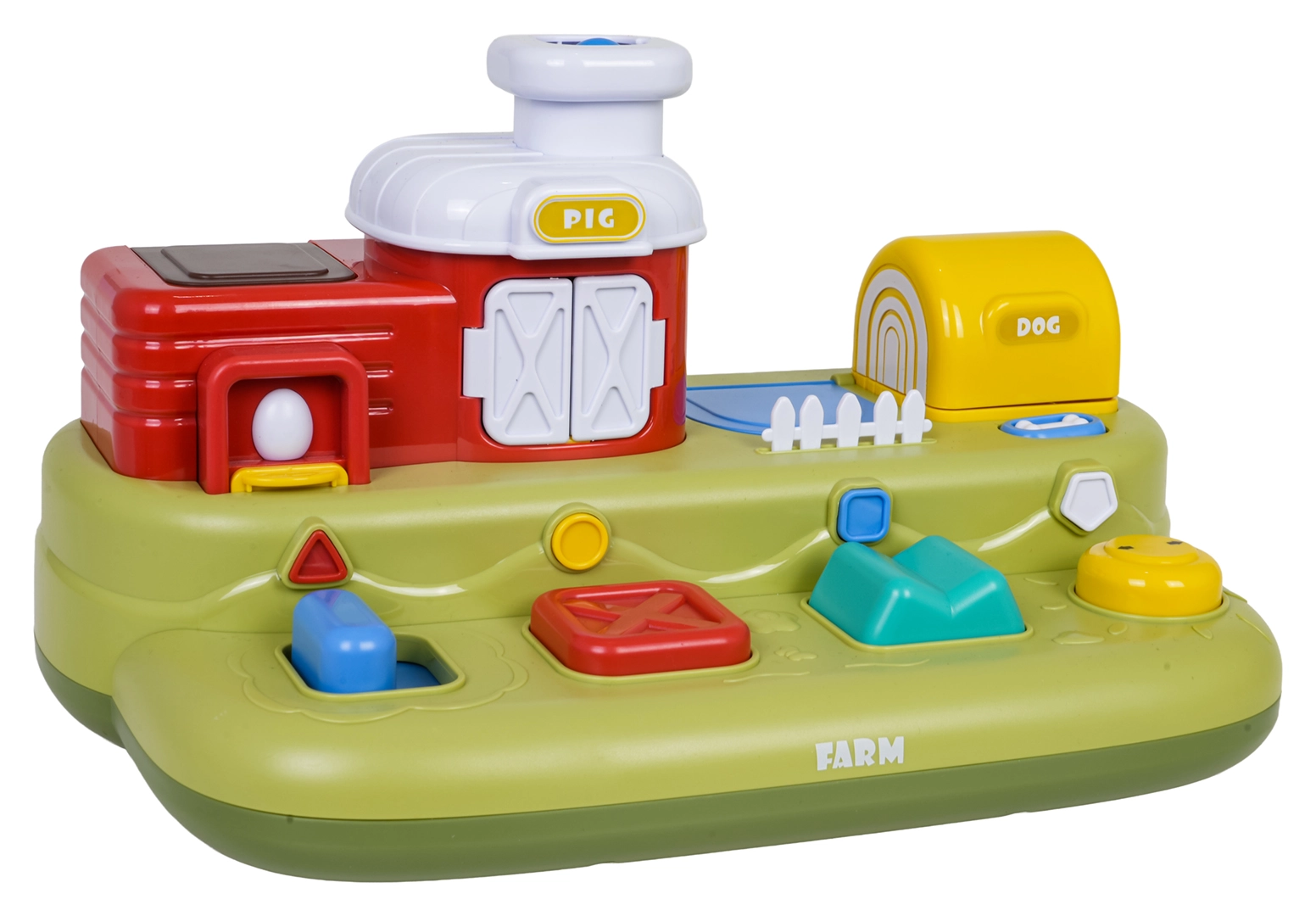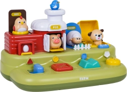 Ši linksma ferma suteikia vaikams daug atradimų: pastūmus mėlyną slankiklį iššoka viščiukas, paspaudus raudoną mygtuką atsidaro durelės su paršiuku, paspaudus žalią – pasirodo avytė, o pasukus geltoną valdiklį išlenda šuniukas. Virš valdiklių yra papildomi mygtukai, kurie įjungia melodijas, gyvūnėlių garsus ir kitus efektus.