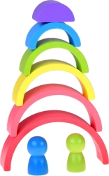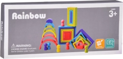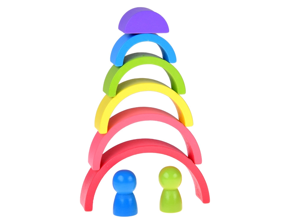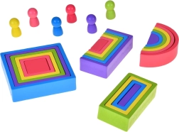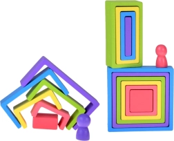 Šis spalvingas medinis rinkinys siūlo atvirą žaidimą, įkvėptą Montessori metodo. Vaikai gali statyti bokštus, tiltus, namelius ir abstrakčias konstrukcijas, rikiuoti detales pagal dydį ir spalvą arba įstatyti ir sluoksniuoti. Žaidimas lavina kūrybiškumą, erdvinį mąstymą ir loginį mąstymą.