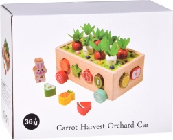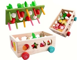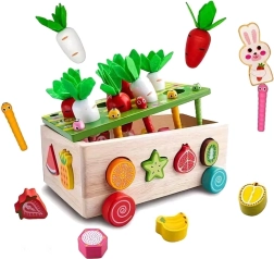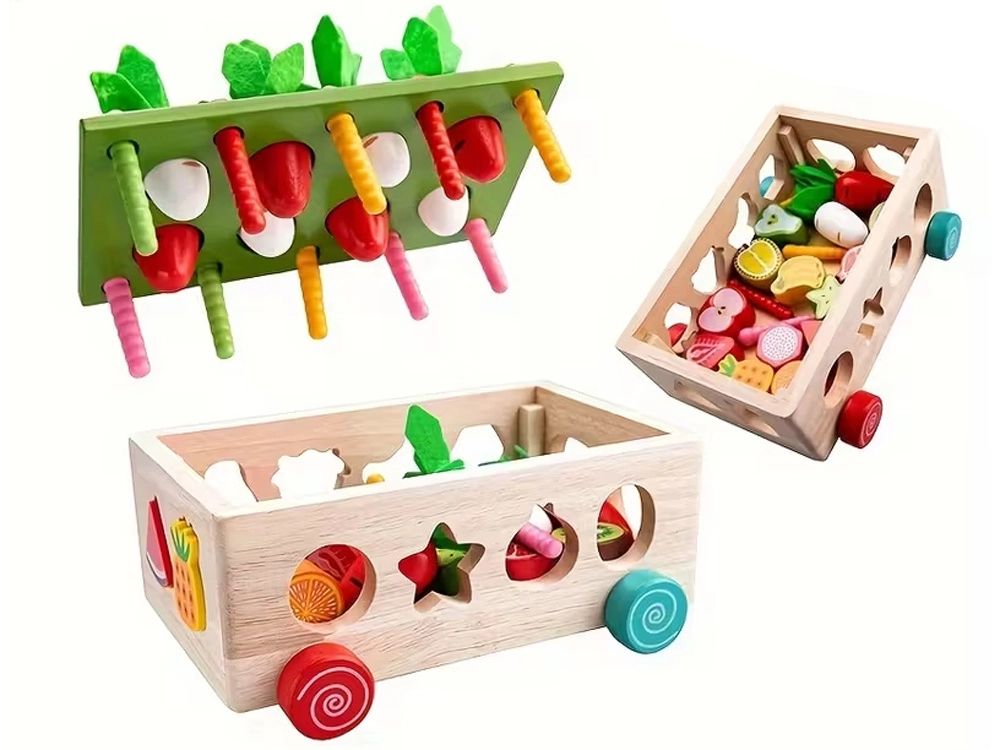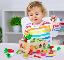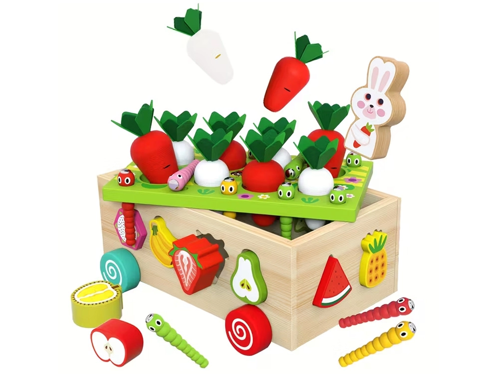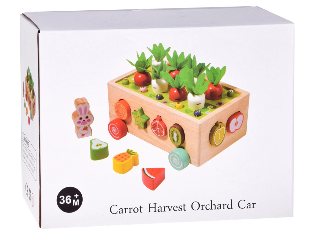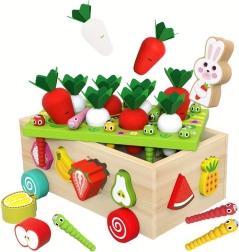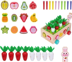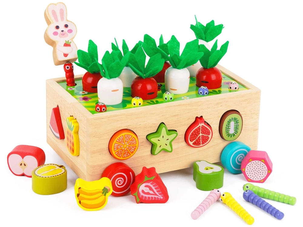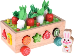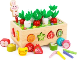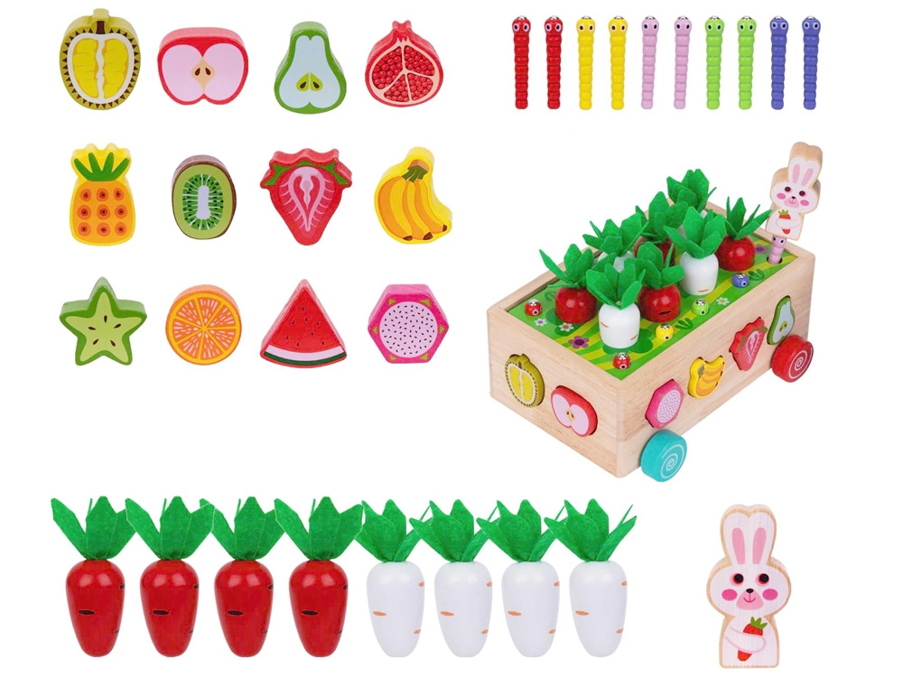 Šis daugiafunkcis medinis Montessori stiliaus rinkinys suteikia vaikams įvairios veiklos: morkyčių su veltinio lapeliais „sodinimas“ ir traukimas, magnetinis kirmėliukų gaudymas triušiuko figūrėle ir klasikinis spalvingų vaisių formų rūšiavimas į atitinkamas angas. Dėl tvirto atlikimo ir glotnių briaunų žaislas yra saugus ir patvarus kasdieniam žaidimui.