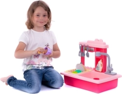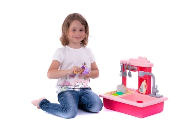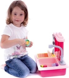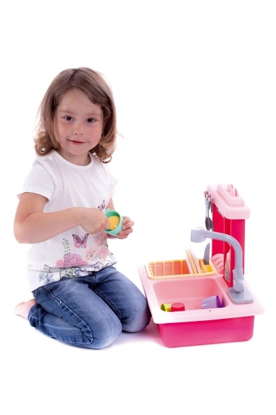 Rožinis vaikiškas indų plovimo kriauklė su baterijiniu čiaupu ir priedais