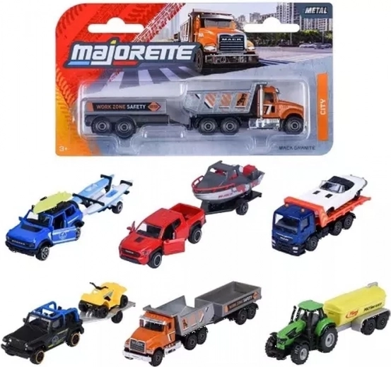 Atraskite įvairią Majorette miesto transporto priemonių su priekabomis kolekciją masteliu 1:64, įkvėptą tikrų modelių iš prekių ženklų MERCEDES-BENZ, JEEP, DEUTZ ir MAN. Metaliniai modeliai su judančiomis dalimis ir nuimamomis priekabomis siūlo realistiškas detales, didelį patvarumą ir begalę pramogų vaikams nuo 3 metų.