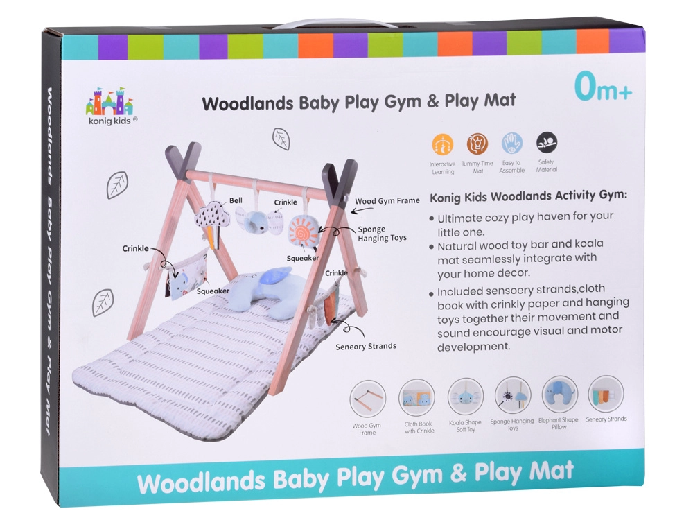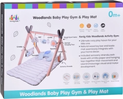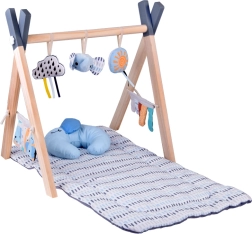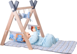 Stilingas medinis baby gym suteikia kūdikiui patogią erdvę tiek gulint ant pilvuko, tiek ant nugaros, o minkšti kabami žaislai skatina siekti, suimti ir tyrinėti skirtingas tekstūras. Kontrastiniai elementai, šiugždantys audiniai ir cypsiukai natūraliai stimuliuoja regą, klausą ir lytėjimą.