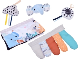 Minkšti kabami žaislai – debesis su juostelėmis, saulutė ir drambliukas – lavina regą, akių–rankų koordinaciją ir pirmuosius griebimo įgūdžius.
