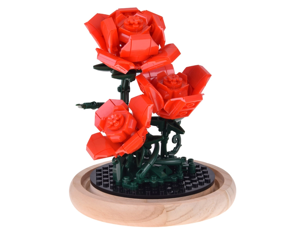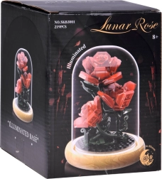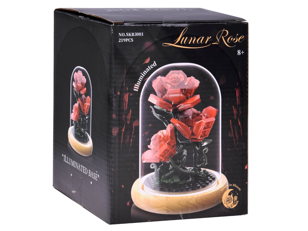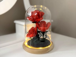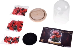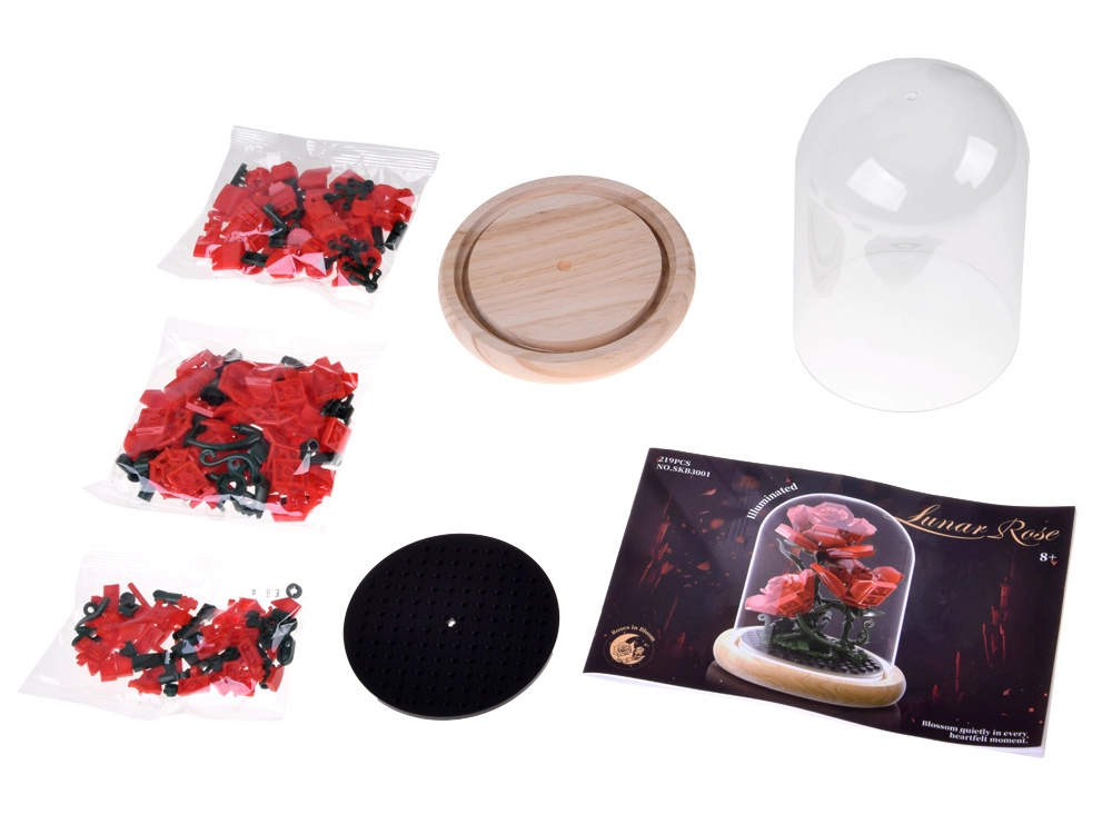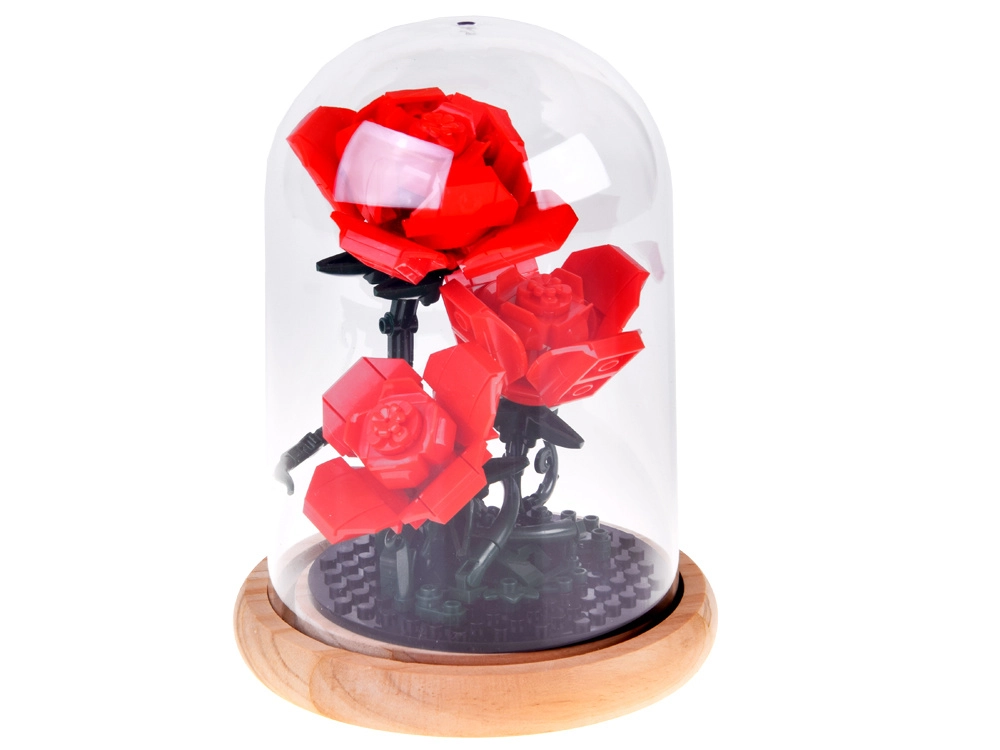 Sukurkite įspūdingą dekoraciją iš kaladėlių – raudona rožė po skaidriu kupolu su LED apšvietimu nušvies lentyną ar rašomąjį stalą. Iš 219 dalių surinksite elegantišką gėlę ant medinio pagrindo, kuri puikiai tinka poilsiui, kūrybiškumui lavinti ir kaip stilinga dovana.