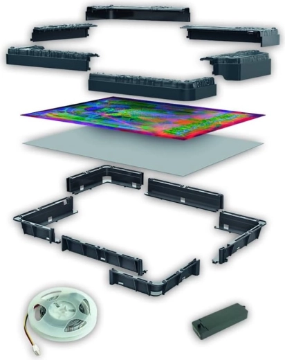 - Dėlionė, kietas kartonas, klijai, montuojamas plastikinis rėmas, elektroninis modulis, RGB LED juosta, etaloninis plakatas, naudojimo instrukcija
