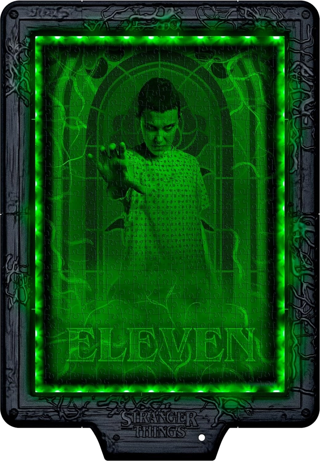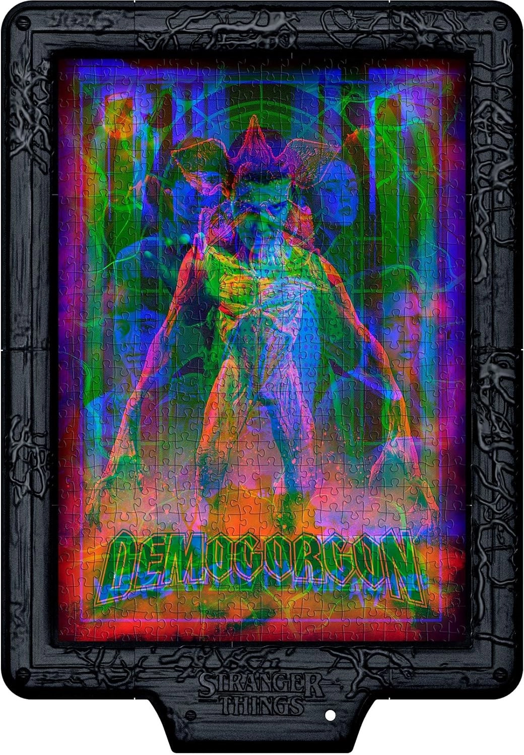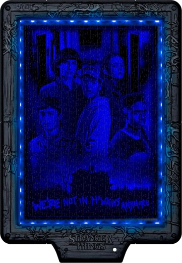 Ši išskirtinė dėlionė atneša STRANGER THINGS serialo kino atmosferą į jūsų namus. Dėl integruoto elektroninio modulio ir RGB LED juostos vaizdas įsižiebus transformuojasi – kiekviena LED spalva atskleidžia kitą Demogorgono medžioklės scenos sluoksnį. Esant įprastam apšvietimui matysite trijų spalvinių lygių perdengtos kompozicijos vaizdą, o tamsoje kiekvienas atspalvis išryškina naują detalę.