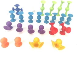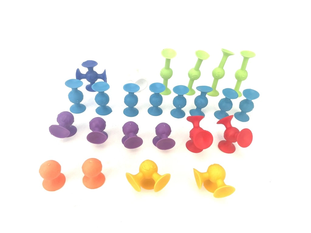 Žaidimų rinkinys su silikoniniais siurbtukais suteikia vaikams begalines konstravimo, dėliojimo ir kūrimo galimybes. Dėl siurbtukų atskiri elementai tvirtai laikosi beveik bet kur – ant lango, stalo, vonioje ar kelioniniuose staliukuose – ir kartu lengvai nusiima nepaliekant žymių.