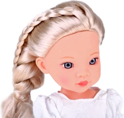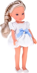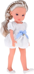 Komplekte yra žavinga balta suknelė su mėlynu kaspinu ir smulkiu perliuku bei balerinos tipo bateliai. Detaliai suformuotas veidas su ryškiomis, žibančiomis akimis suteikia lėlei realistišką išraišką ir paverčia ją puikia drauge vaikų kambaryje ar kolekcijoje.