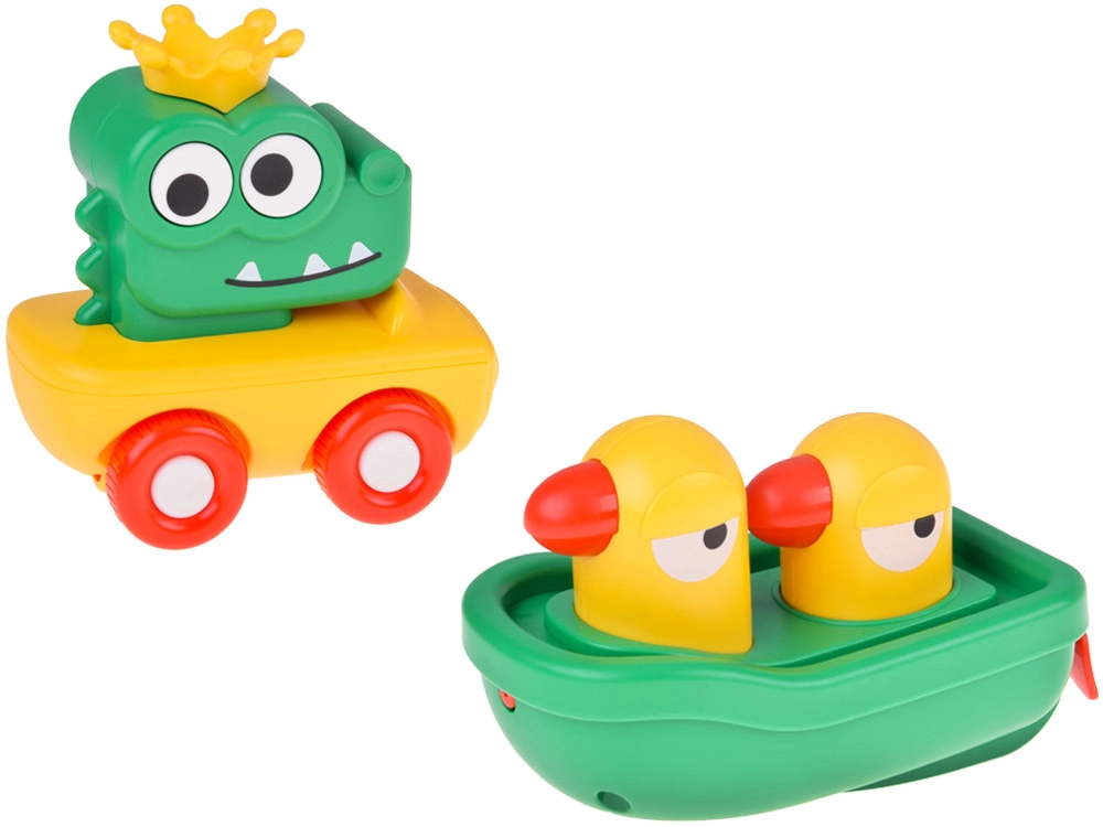 Rinkinyje yra krokodilas automobilyje, laivelis su dviem ančiukais ir pylimo puodelis. Plūduriuojantys elementai skatina vaizduotę ir prailgina žaidimų laiką vonioje.