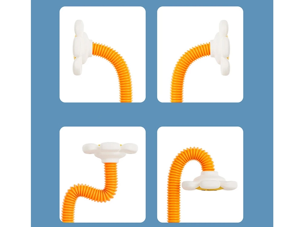 Praktiška lanksti žarna leidžia nukreipti vandens tėkmę tiksliai ten, kur reikia, o keičiami antgaliai sukuria įvairius fontanų efektus – nuo švelnaus dulksnojimo iki žaismingo purslojimo. Stabilūs siurbtukai laiko rinkinį vietoje tiek ant lygių plytelių, tiek ant vonios krašto.