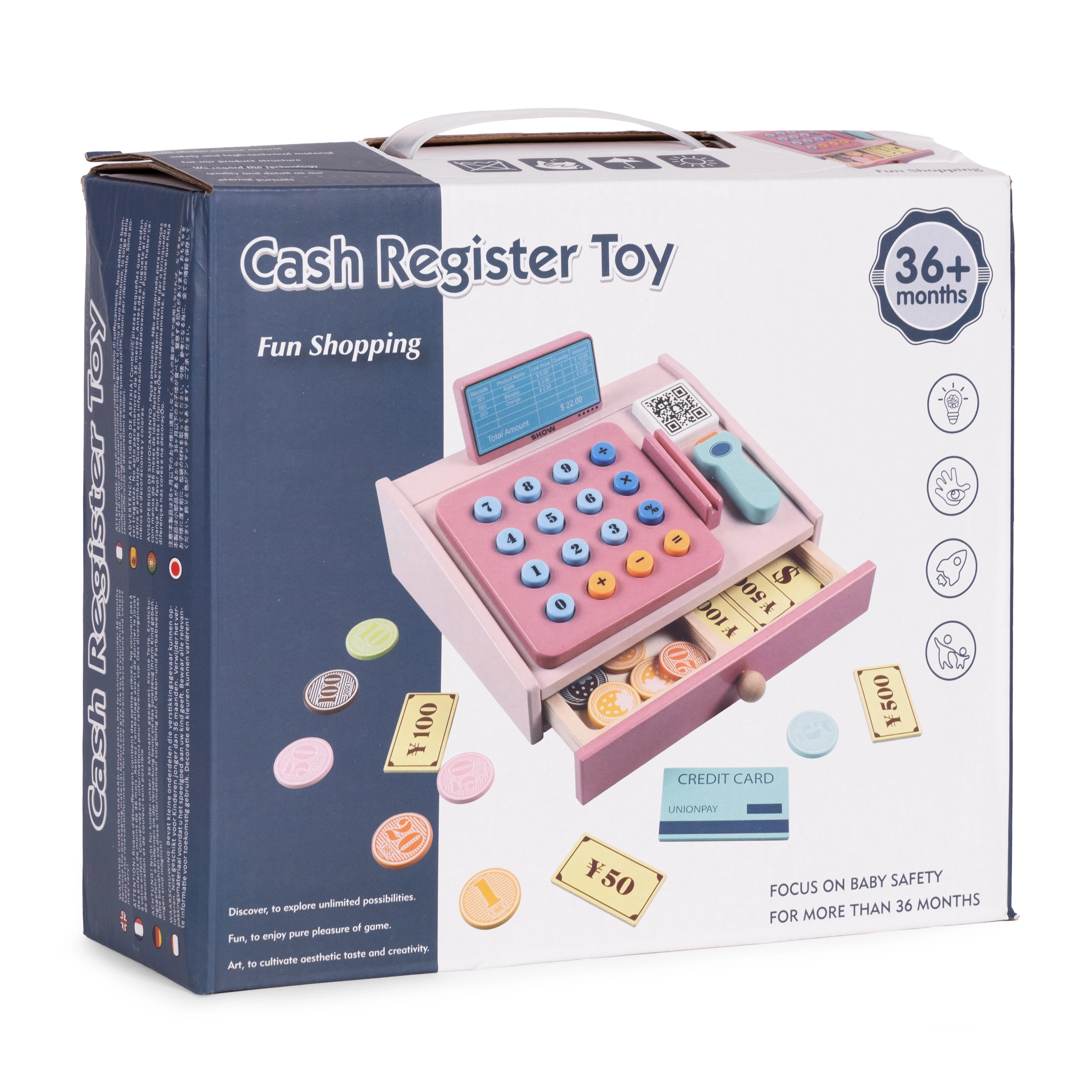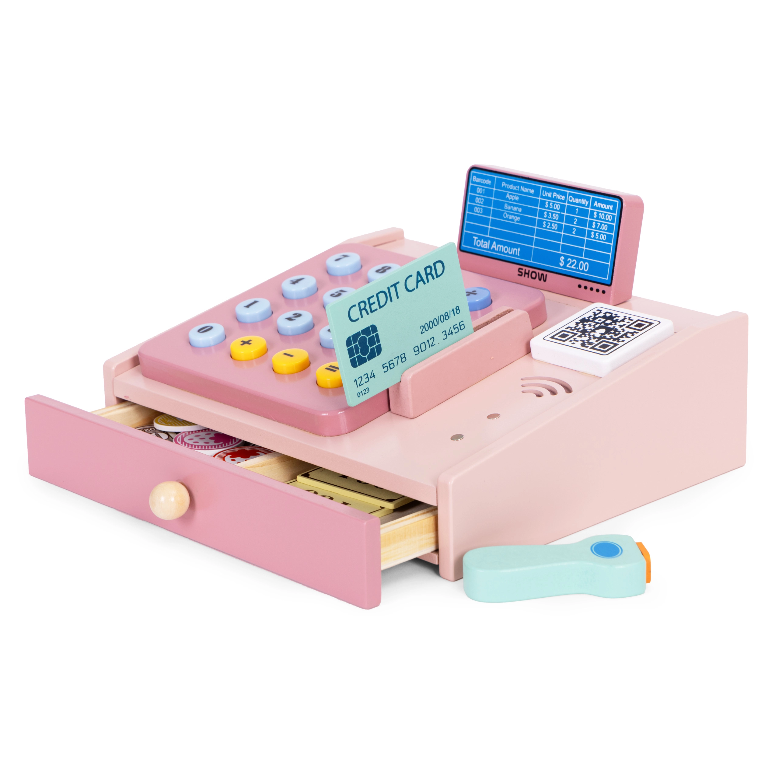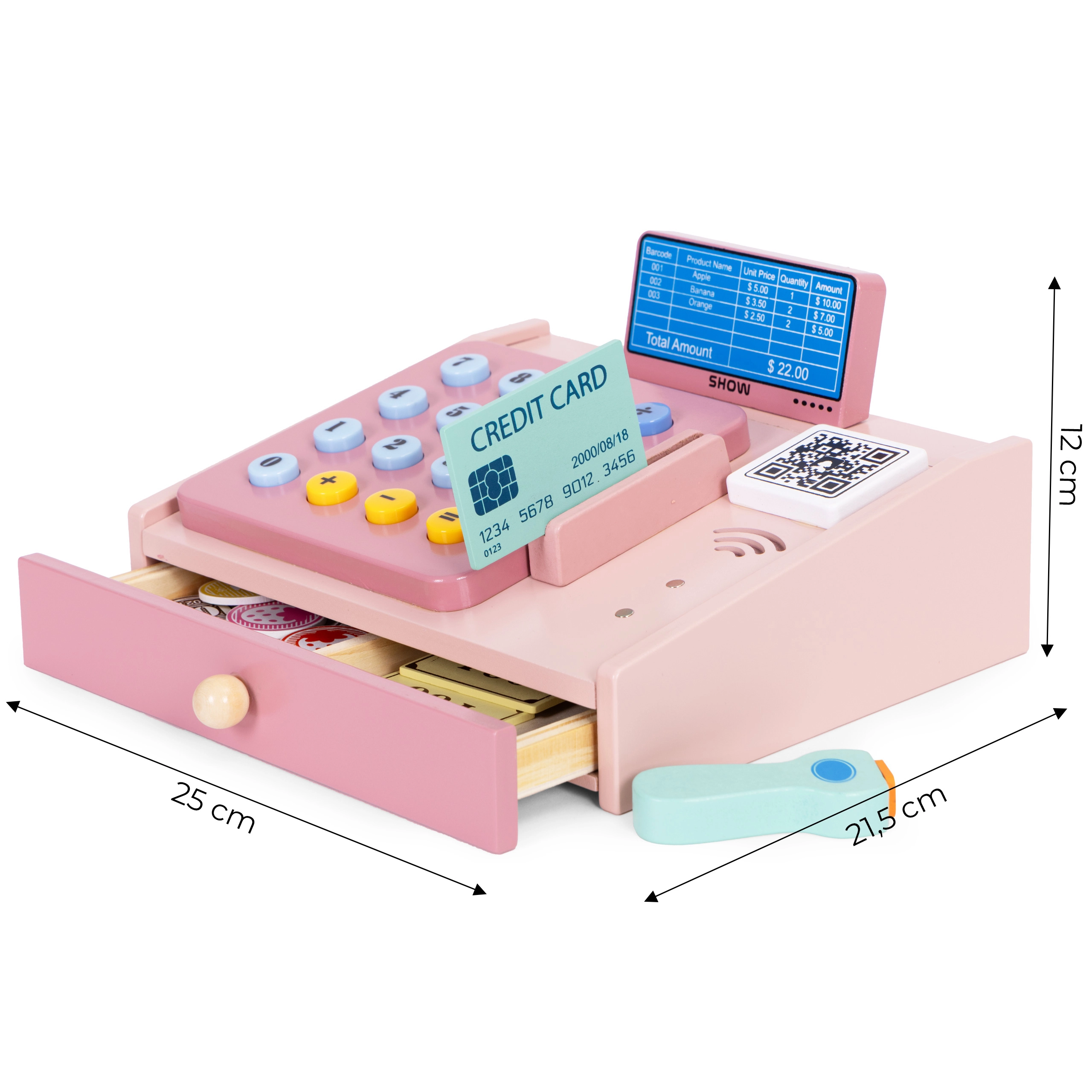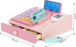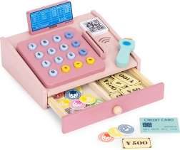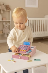 Ši kokybiška medinė kasa švelnių pastelinių spalvų puikiai tiks vaikų kampeliui ar kambariui. Realistiniai elementai, tokie kaip rankinis skaitytuvas, mokėjimo terminalas, mygtukų klaviatūra ir ištraukiamas stalčiukas, paverčia parduotuvės žaidimą smagia ir edukacine veikla. Vaikai lavina pagrindinę matematiką, loginį mąstymą ir komunikaciją.