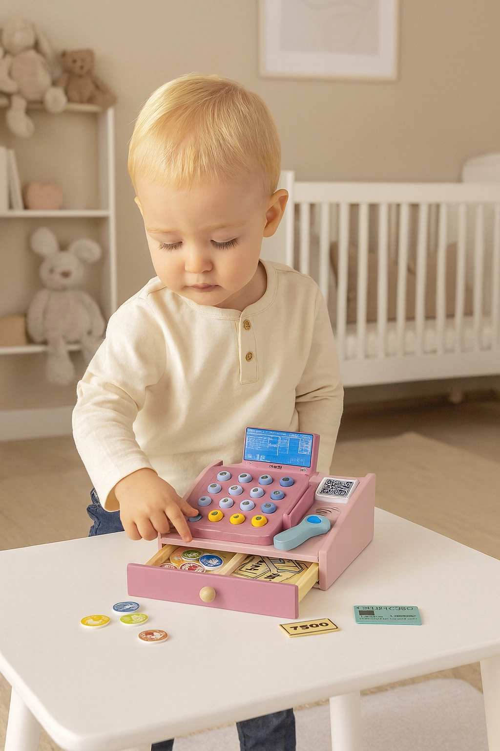 Ištraukiama lentynėlė talpina banknotus ir monetas, tad vaikai gali treniruotis rūšiuoti ir skaičiuoti pinigus bei tvarkyti kasą.