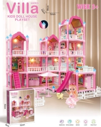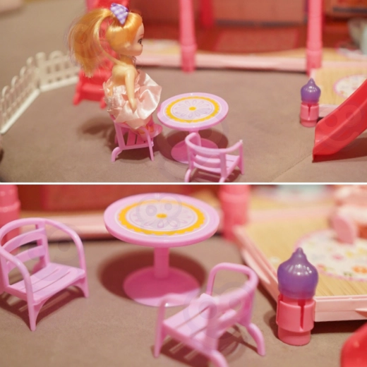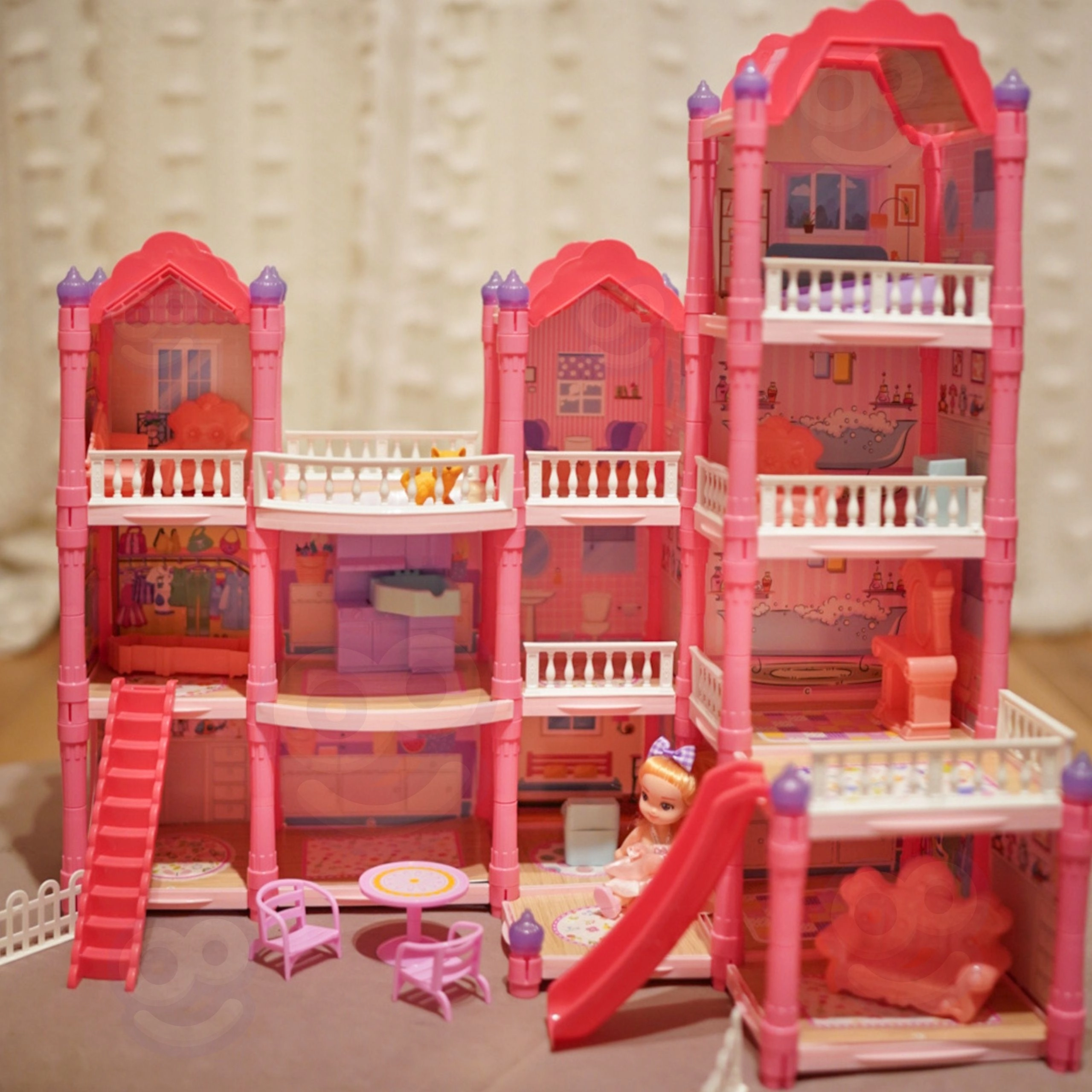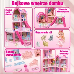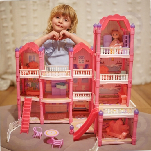 Atraskite žavingą trijų aukštų lėlių namelį su rožiniu stogu, gausia įranga ir naktiniu apšvietimu. Rinkinyje yra 296 dalys, įskaitant mielus baldus, priedus ir lėlę, todėl vaikai gali patys įrengti kiekvieną kambarį. Čiuožykla, laiptai ir terasa suteikia dar daugiau pramogų ir skatina kūrybiškumą, vaizduotę bei smulkiąją motoriką.