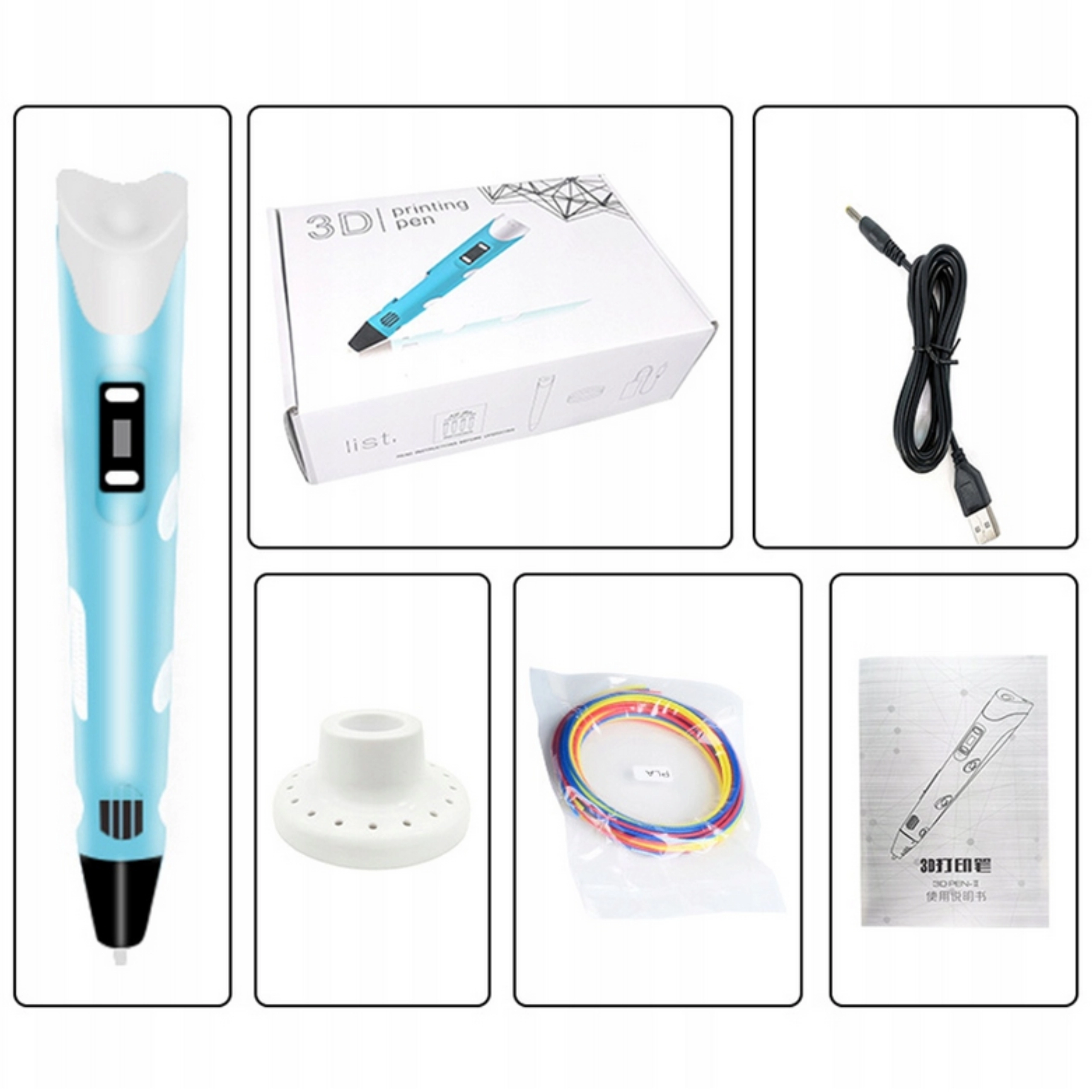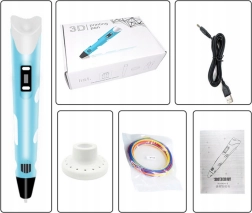 - 3D rašiklis (1 vnt.), PLA siūlas 12 × 3 m (įvairios spalvos), USB laidas (1 vnt.), instrukcija (EN)