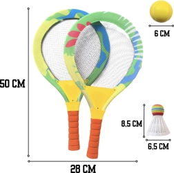 Pakuotėje yra viskas, ko reikia iškart pradėti žaisti: 2 didelės raketės, putų kamuoliukas ir spalvingas plunksninis kamuoliukas su minkštu galiuku. Patogūs putų laikikliai yra neslystantys ir gerai telpa vaiko rankoje. Rinkinys puikiai tinka sodui, kiemui, paplūdimiui ir žaidimams patalpose.