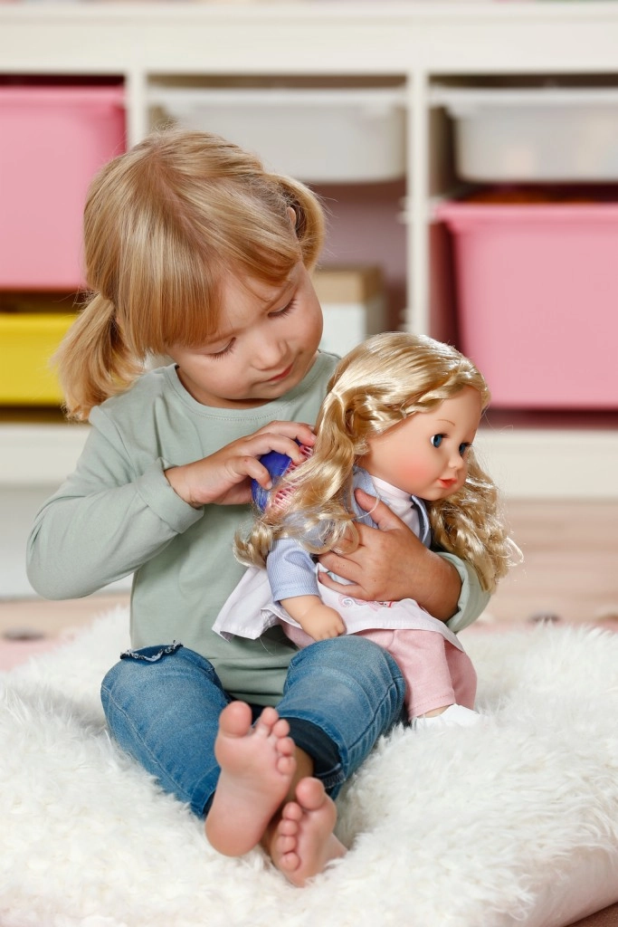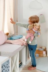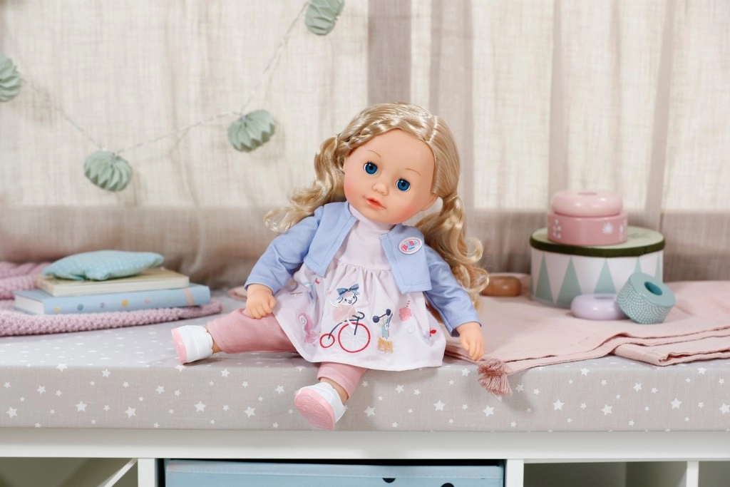 Rinkinyje yra pilnas drabužių komplektas: švelni suknelė su lengvu paltuku, patogios tamprės ir bateliai. Dėl judrių galūnių lėlę lengva pasodinti ir aprengti. Žaidimas su lėle lavina smulkiąją motoriką, empatiją ir vaizduotę – idealiai tinka kaip pirma lėlė patiems mažiausiems.