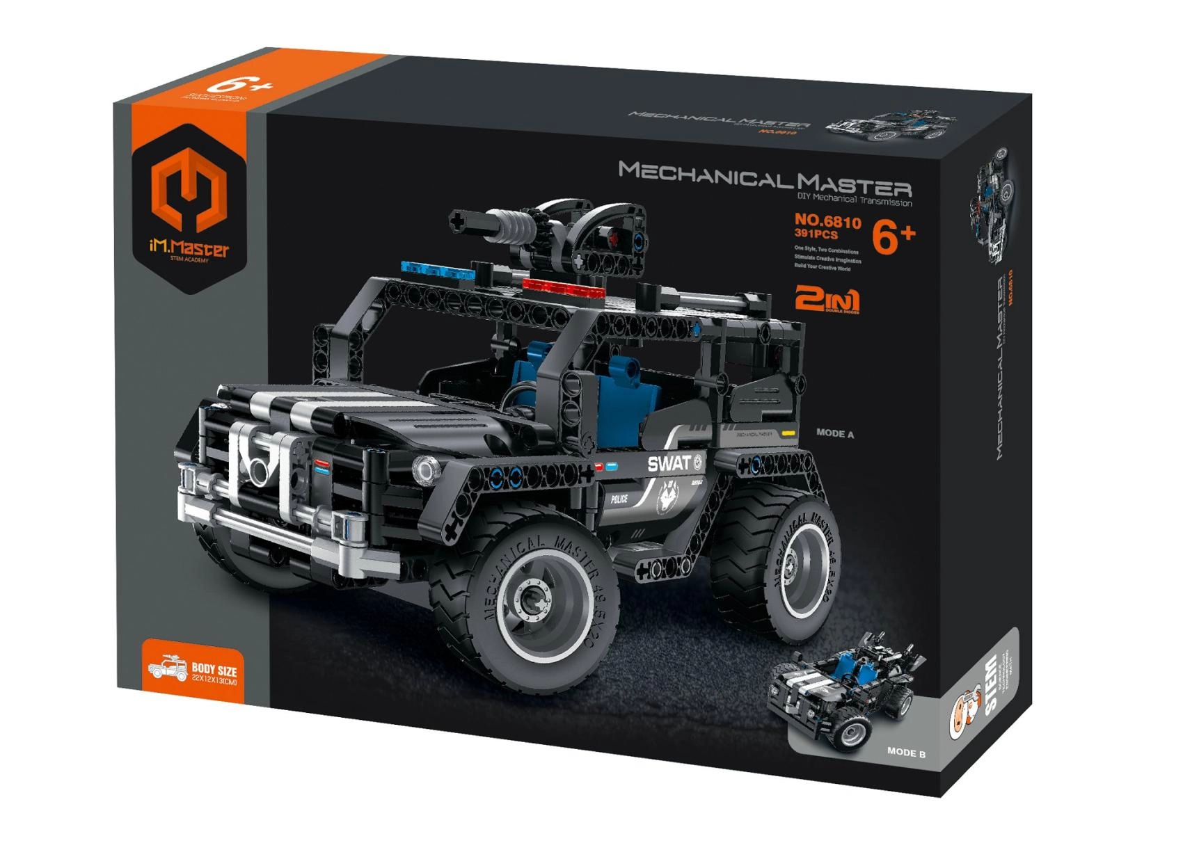 Atraskite konstravimo ir žaidimo malonumą viename. iM.MASTER rinkinys leidžia pasistatyti savo funkcionalų visureigio modelį net dviem variantais. Dėl apgalvotų detalių ir pridedamos instrukcijos statyba yra aiški ir motyvuojanti tiek mažiesiems, tiek vyresniems konstruktoriams.