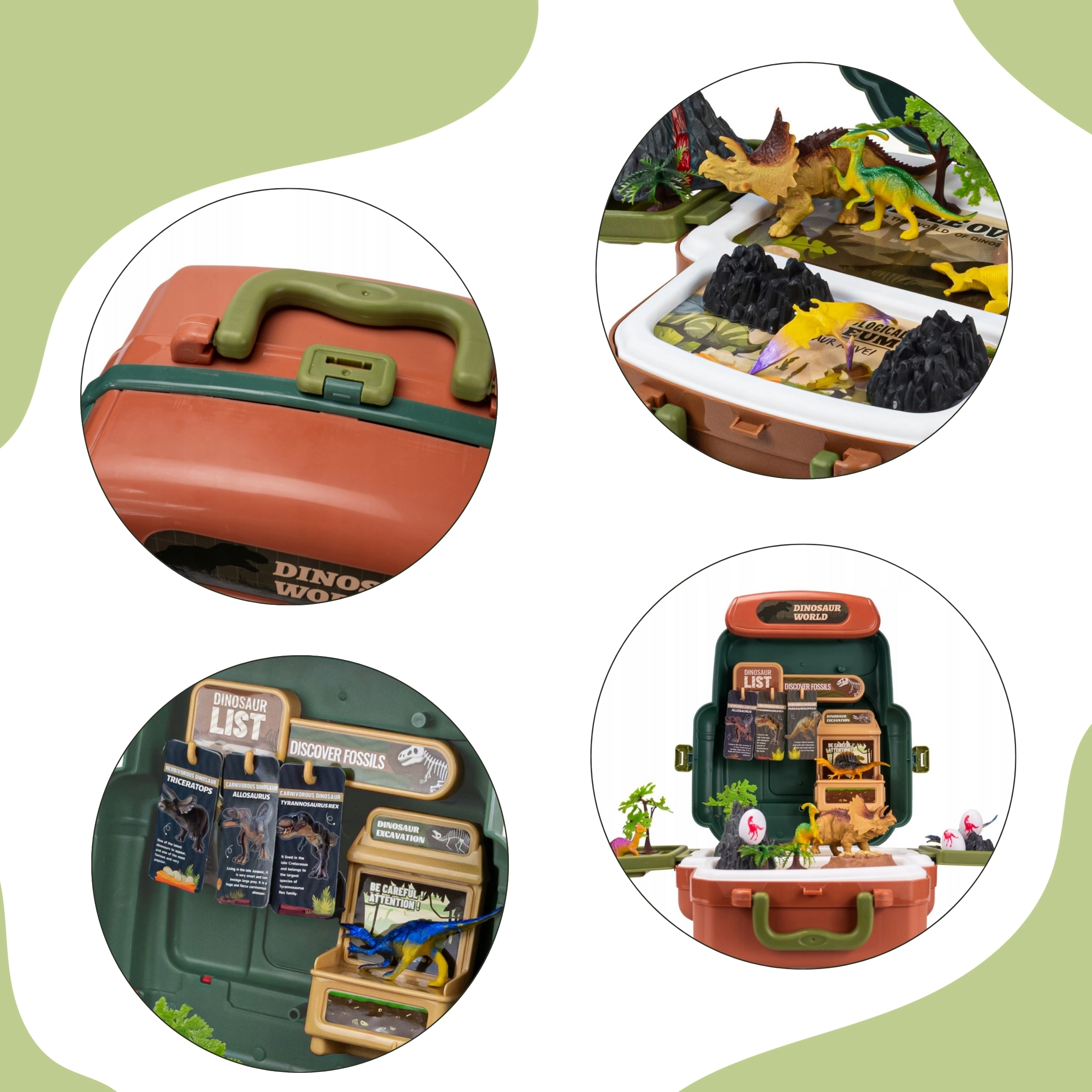 - Lagaminėlis su vidine scena, kelių rūšių dinozaurų figūrėlės, ugnikalnis, akmenys, lizdas ir kiaušiniai, medžiai ir augalai, smulkūs įrankiai/priedai, edukacinės kortelės