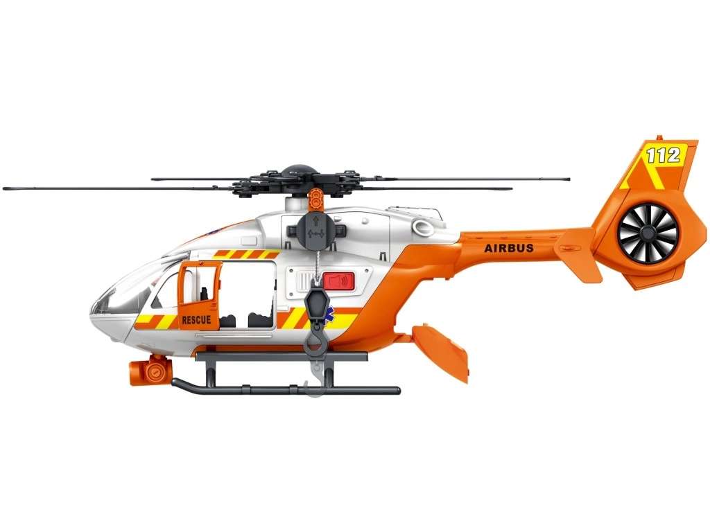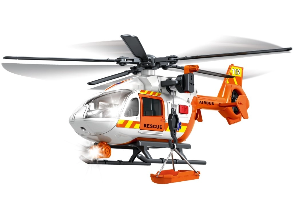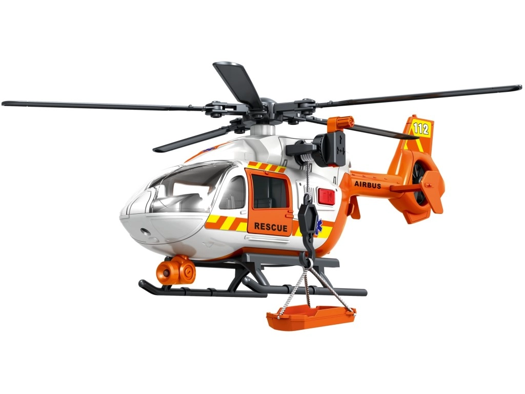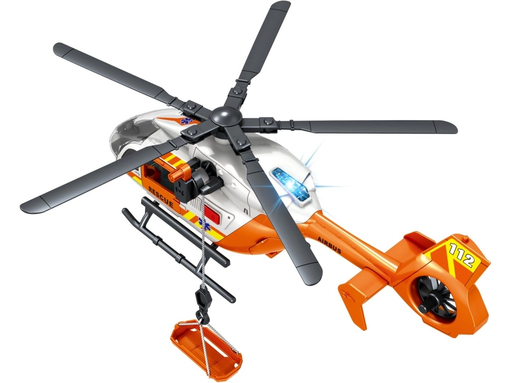 Šis detaliai sukurtas gelbėjimo sraigtasparnis baltai oranžinės spalvos derinyje suteikia vaikams autentiško smagumo. Dėl besisukančių rotorių, nulenkiamų slidžių ir veikiančios gervės su krepšiu arba neštuvais vaikai lengvai kurs tikroviškus iškvietimus ir sužeistųjų transportavimą.