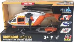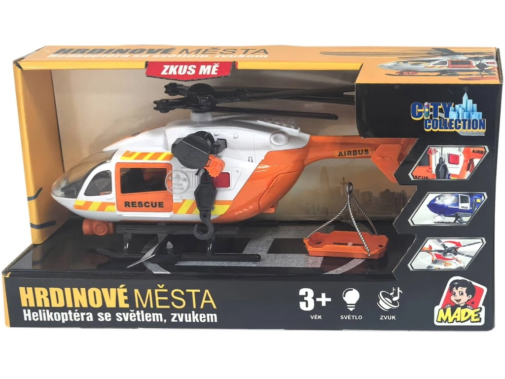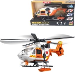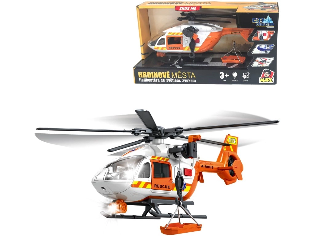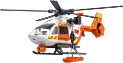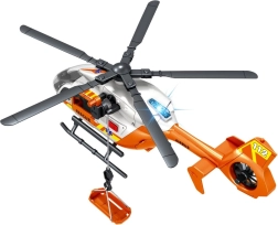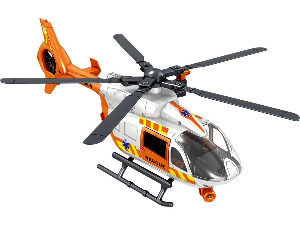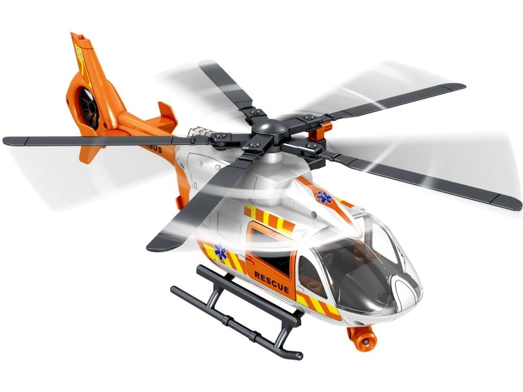 Šis detaliai sukurtas gelbėjimo sraigtasparnis baltai oranžinės spalvos derinyje suteikia vaikams autentiško smagumo. Dėl besisukančių rotorių, nulenkiamų slidžių ir veikiančios gervės su krepšiu arba neštuvais vaikai lengvai kurs tikroviškus iškvietimus ir sužeistųjų transportavimą.