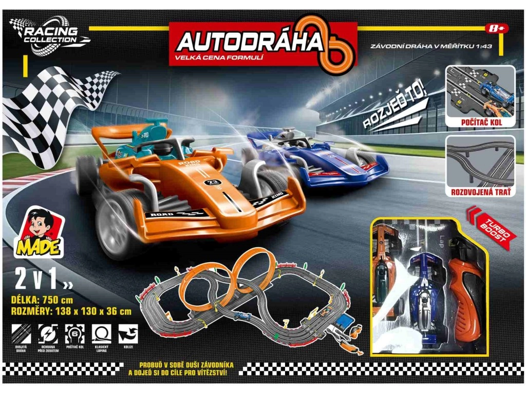 Ši automobilių trasa su formulėmis pavers jūsų svetainę lenktynių ringu. Dėl tvirtos konstrukcijos ir apgalvoto išdėstymo ji siūlo dinamiškas lenktynes, paprastą valdymą ir iškart paruošta važiavimui dėl pridedamo 12 V adapterio. Surinktos trasos matmenys 138 × 130 × 36 cm suteikia pakankamai vietos įspūdingiems pravažiavimams.
