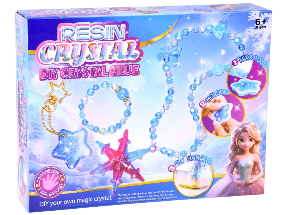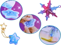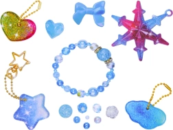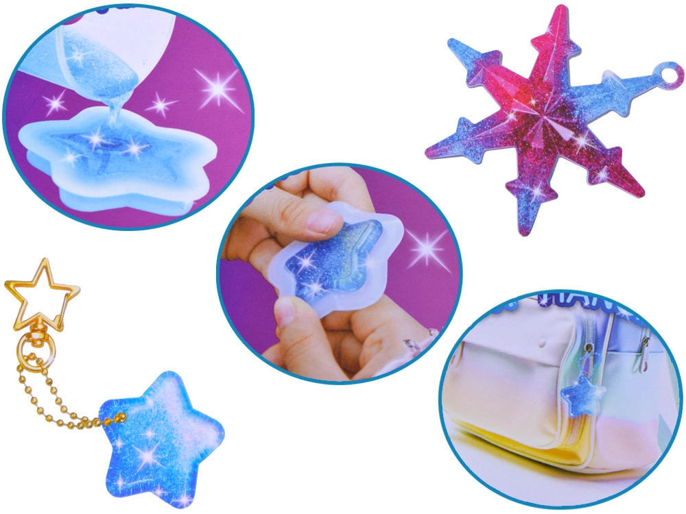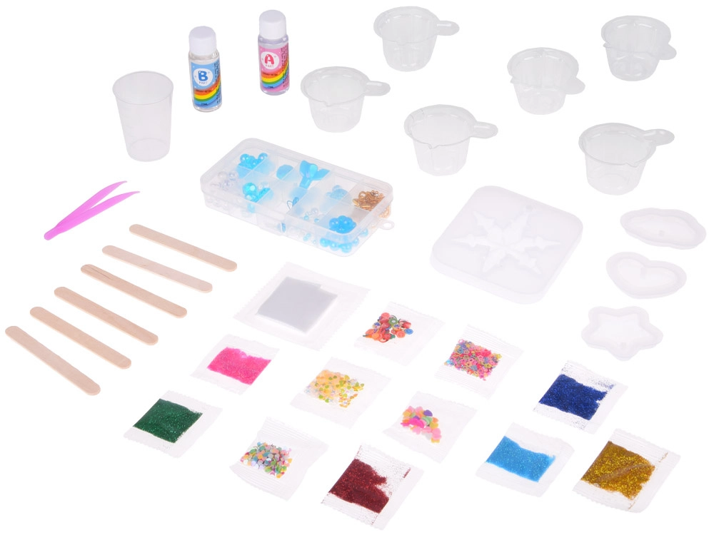 Šis kūrybinis rinkinys leidžia lengvai lieti krištolo skaidrumo dervos papuošalus mėgstamomis formomis – žvaigždė, debesėlis ar širdelė. Sumaišykite A ir B dalis santykiu 1:1, įberkite blizgučių arba spalvotų konfeti, supilkite į silikonines formas ir sukietėjus papildykite metalinių žiedelių, grandinėlių ir karoliukų elementais. Dėka praktiško organizatoriaus visi komponentai bus tvarkingai po ranka.