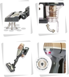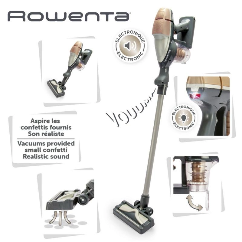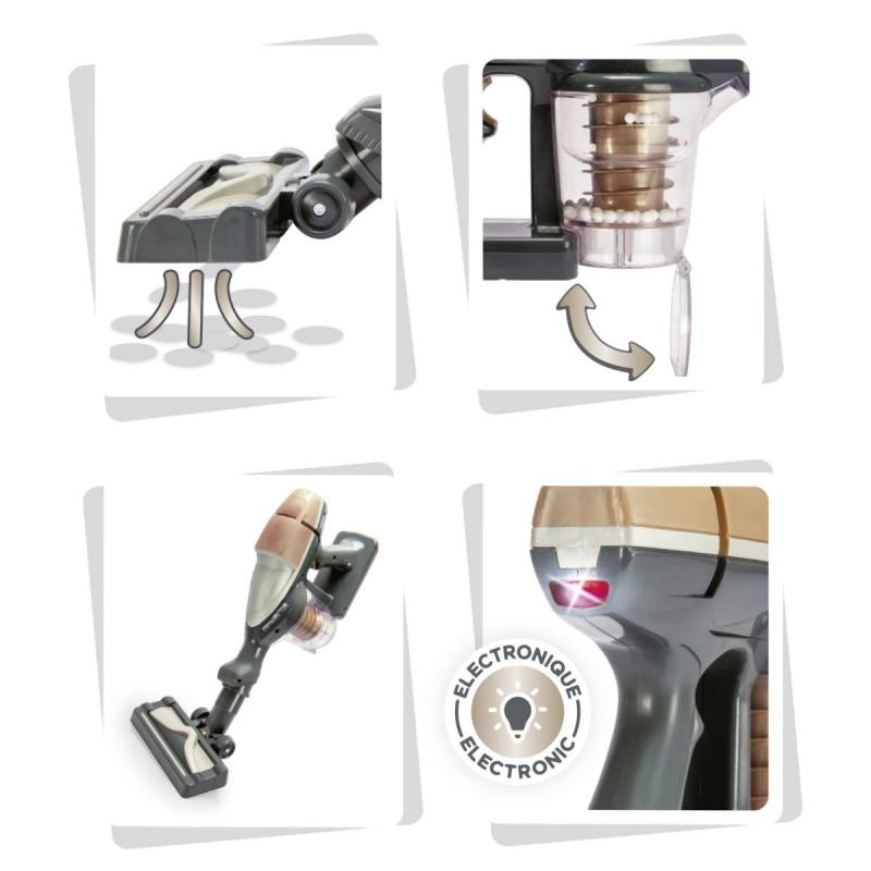 Stilingas vaikiškas rankinis dulkių siurblys, įkvėptas modelio ROWENTA Air Force 360, suteikia vaikams realistišką tvarkymosi patirtį. Paspaudus mygtuką įsijungia LED indikatorius, pasigirsta tikroviškas siurbimo garsas ir aktyvuojamas lengvas prisiurbimas. Permatomą talpą su sūkurinėmis granulėmis galima atidaryti ir ištuštinti kaip tikrą buitinį prietaisą. Galimybė naudoti ir kaip rankinį siurblį skatina kūrybišką žaidimą.