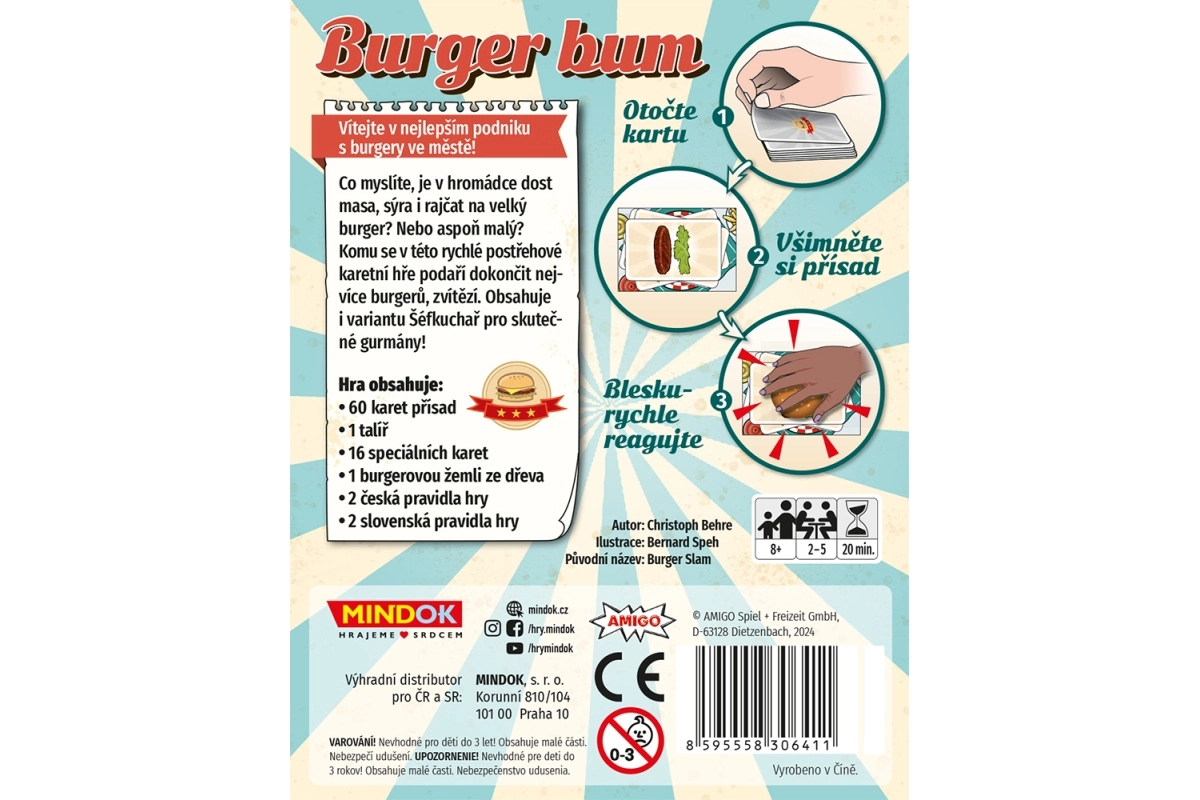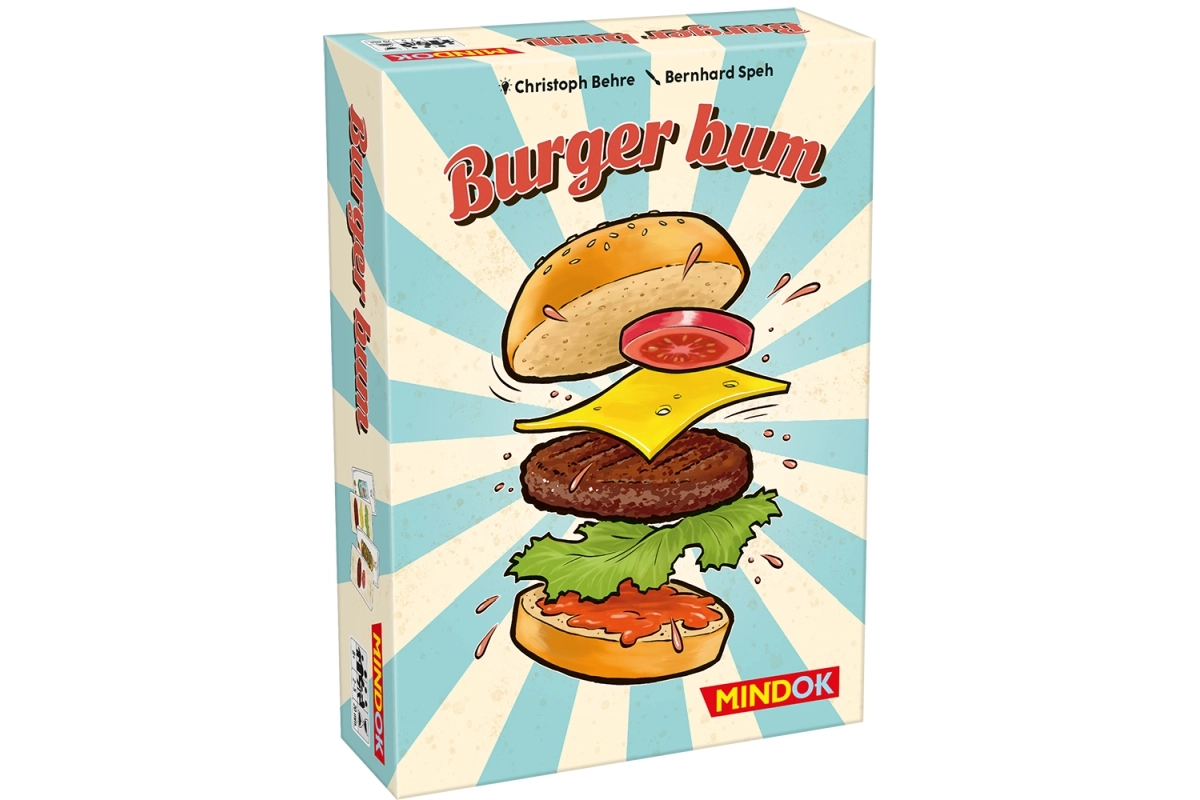 Tapkite greito burgerių dėliojimo meistru žvaliu kortų žaidimu Burger Bum. Dėliokite ingredientus ant lėkštės, teisingai atspėkite, kada burgeris paruoštas, ir laiku pagriebkite bandelę. Greitas žaidimo tempas, įtempti reakcijos mūšiai ir pramoga visai šeimai nuo 8 metų.