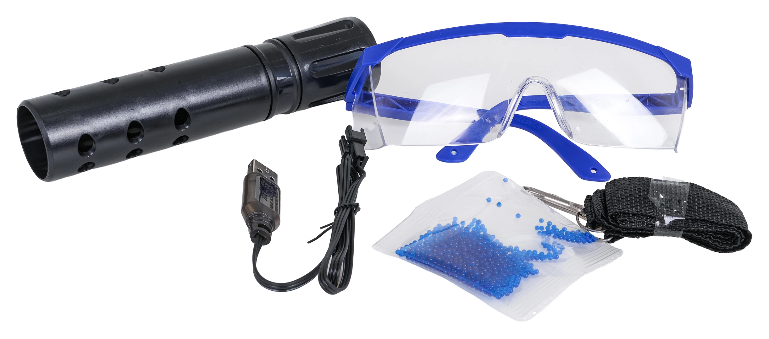 - Blasteris M416, dėtuvė, slopintuvas, taikiklis, USB kabelis, 7,4 V akumuliatorius, maišelis su apie 500 vnt. kamuoliukų paruošimui, diržas, apsauginiai akiniai, instrukcija