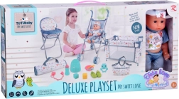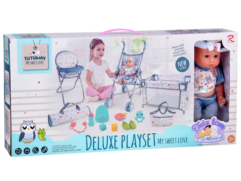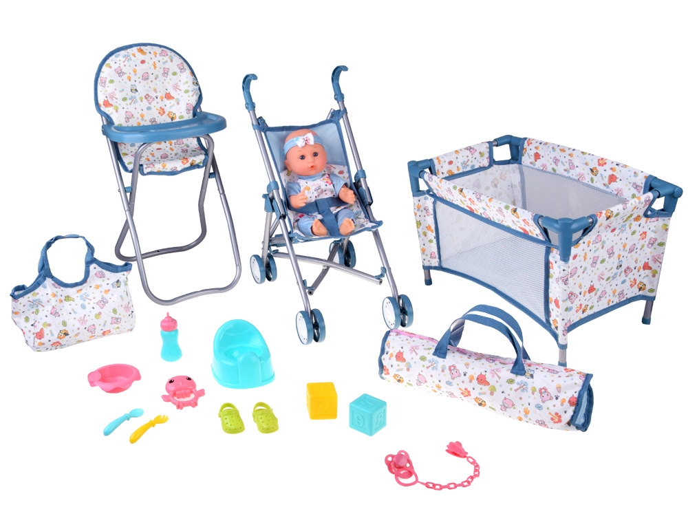 Pilnas žaidimų rinkinys mažiesiems globėjams: miela kūdikio lėlė su gausia įranga maitinimui, pervystymui, miegui ir pasivaikščiojimams. Rinkinyje yra sulankstomas vežimėlis, maitinimo kėdutė, kelioninė lovytė su krepšiu, naktipuodis, buteliukas, dubenėlis su šaukšteliu ir šakute, čiulptukas ant grandinėlės, žaislai ir bateliai. Šis rinkinys lavina empatiją, kūrybiškumą ir vaidmeninius įgūdžius bei suteikia valandas pramogų namuose ir kelionėse.
