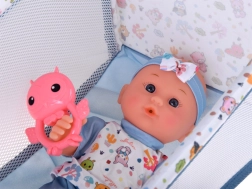 Pradžiuginkite vaikus realistišku kūdikio priežiūros rinkiniu, kuriame yra viskas kasdieniams ritualams – nuo maitinimo ir pasivaikščiojimų iki migdymo. Lėlė turi judančias galūnes, minkštus drabužėlius ir patogiai sėdi tiek kėdutėje, tiek vežimėlyje. Vežimėlis ir lovytė turi lengvą, sulankstomą rėmą, todėl juos lengva nešti ir greitai sutvarkyti.