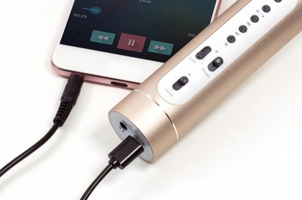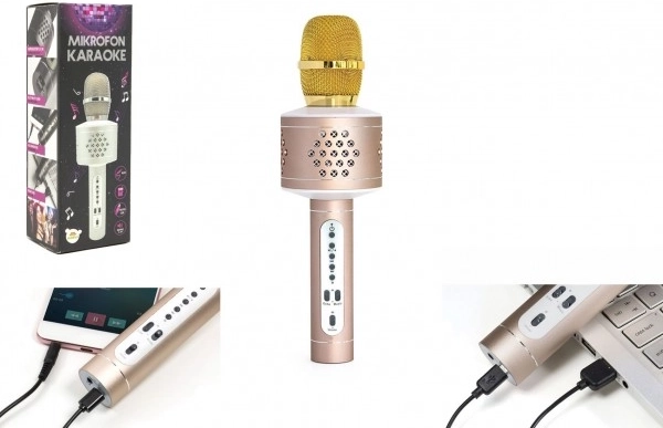 - karaokės mikrofonas, USB–Micro USB įkrovimo kabelis, garso kabelis, instrukcija