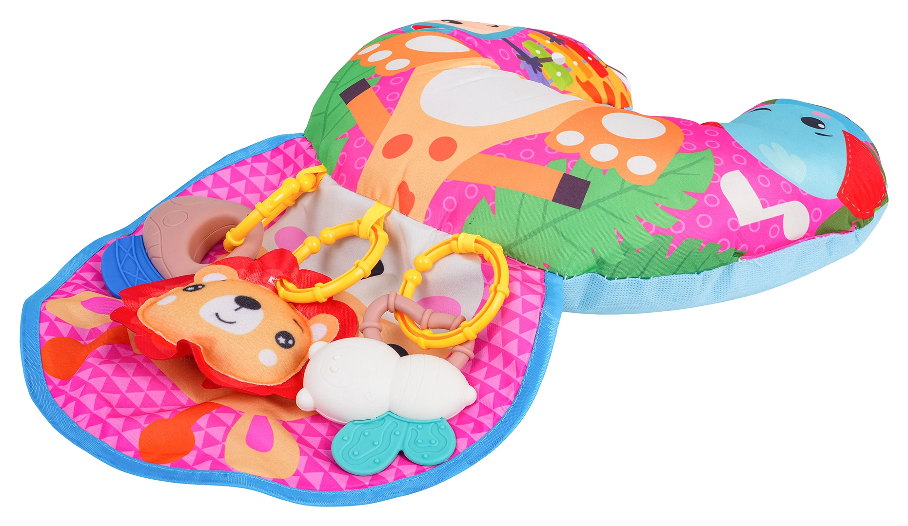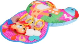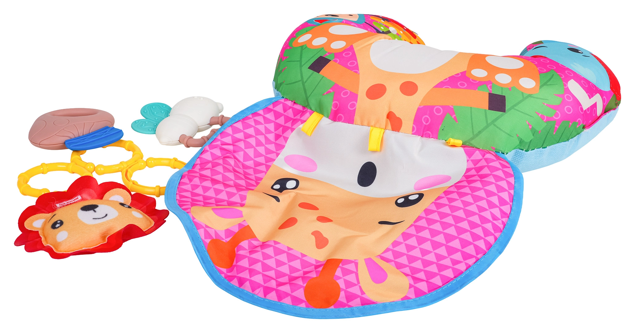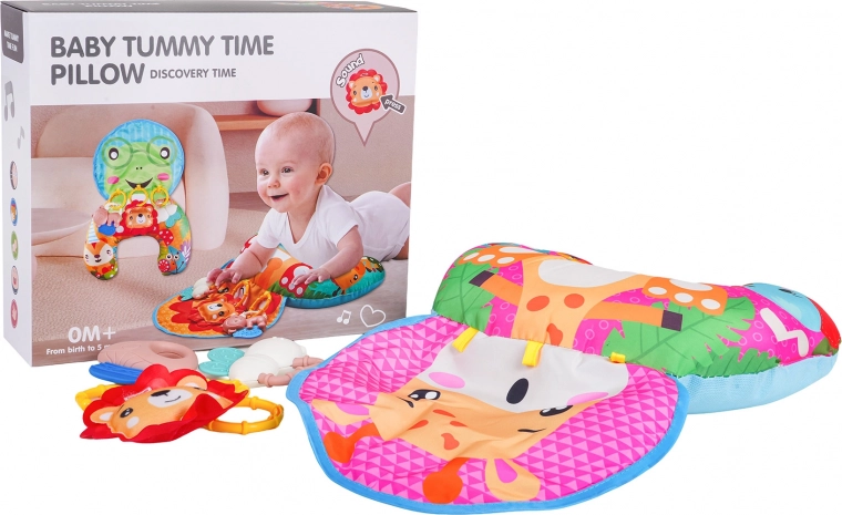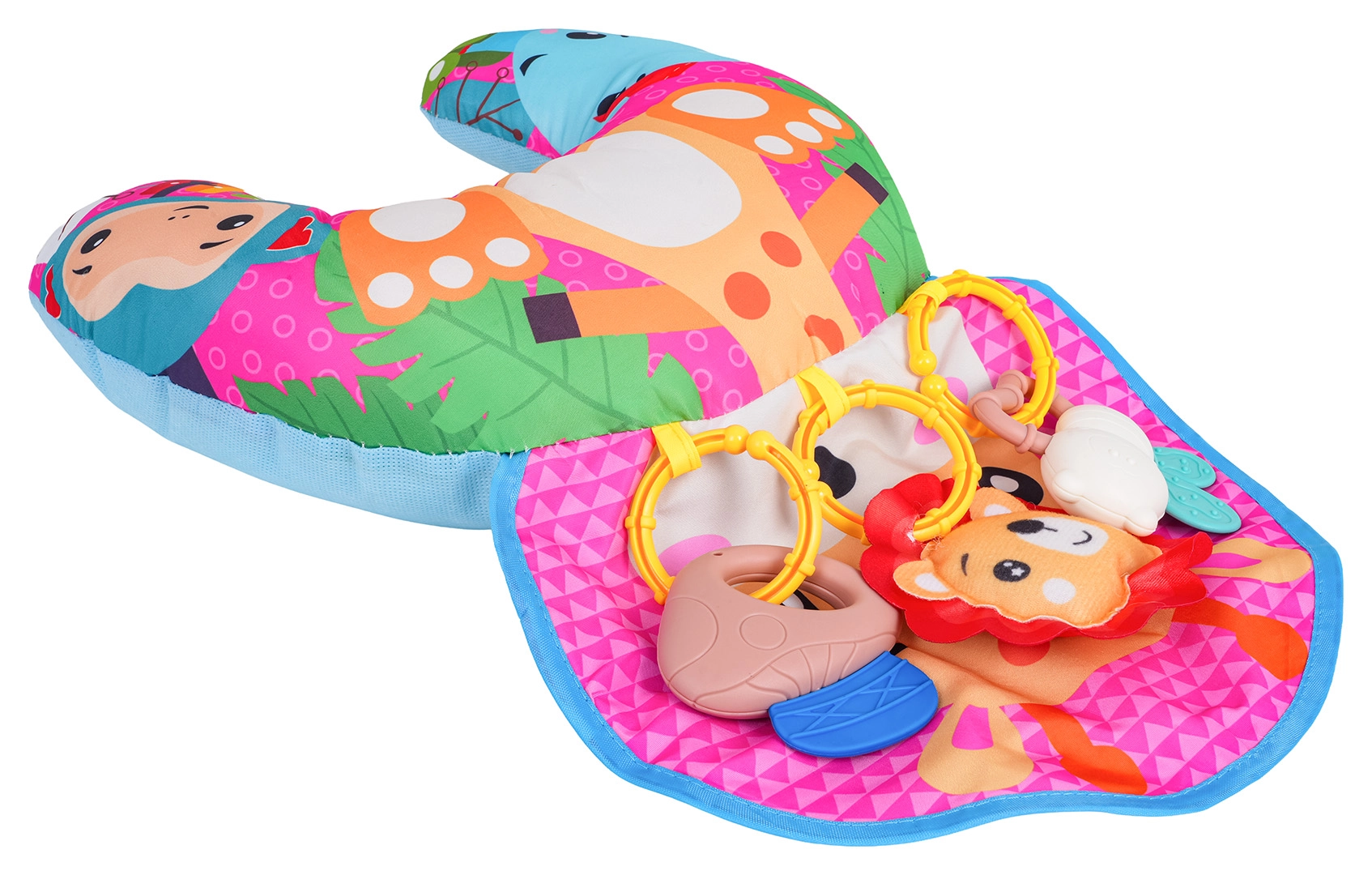 Minkšta ir spalvinga U formos kūdikių pagalvė su žirafos motyvu padeda mažyliui žaidžiant ant pilvuko ir sėdint. Komplekte yra nuimami kabinami žaislai su kramtukais, barškučiu ir cypliuku, kurie lavina pojūčius ir smulkiąją motoriką. Tinka nuo pirmųjų gyvenimo dienų, pagaminta iš saugių medžiagų.