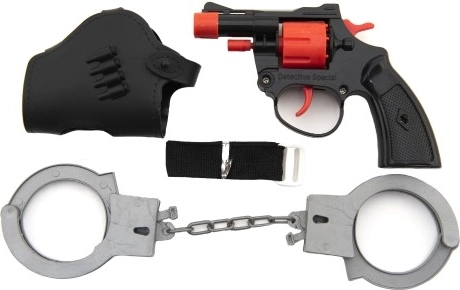 Šis vaikiškas kapsulinis pistoletas suteikia daug saugaus žaidimo ir skatina vaizduotę žaidžiant policininkus. Rinkinyje yra patogus dėklas diržui ir plastikiniai antrankiai, kurie dar labiau sustiprina žaidimo autentiškumą. Dėl kompaktiško 13 cm dydžio pistoletą lengva laikyti net mažesnėms rankoms.