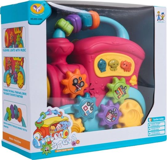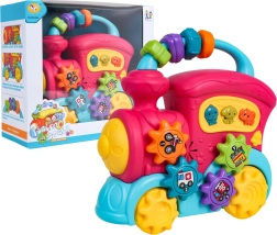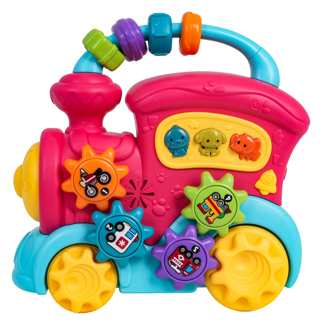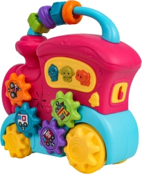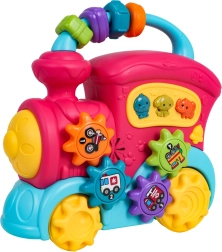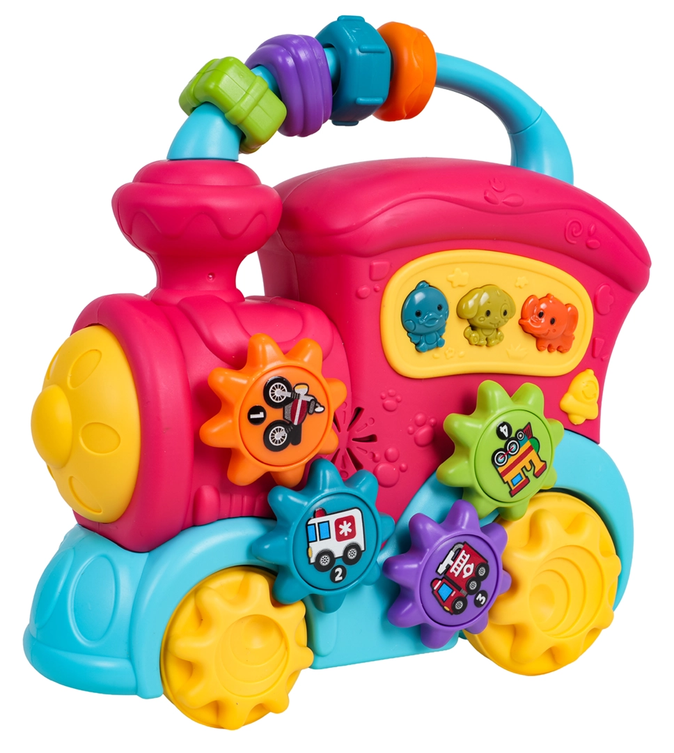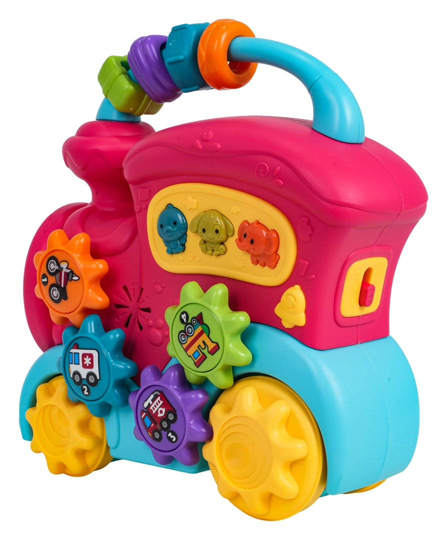 Šis spalvingas traukinukas iš kokybiško plastiko pradžiugins mažus tyrinėtojus gausybe interaktyvių elementų. Ant stogo rasite sensorinius karoliukus, šone – krumpliaračius su paveikslėliais ir mygtukus su gyvūnėliais, kurie paspaudus atkuria anties, šuns ar dramblio garsus, linksmus skambučius ir melodijas. Stumdant traukinuką sukasi ratai, krumpliaračių mechanizmas skleidžia malonų barškesį, priekinis žibintas užsidega, taip skatindamas vaiką toliau tyrinėti.