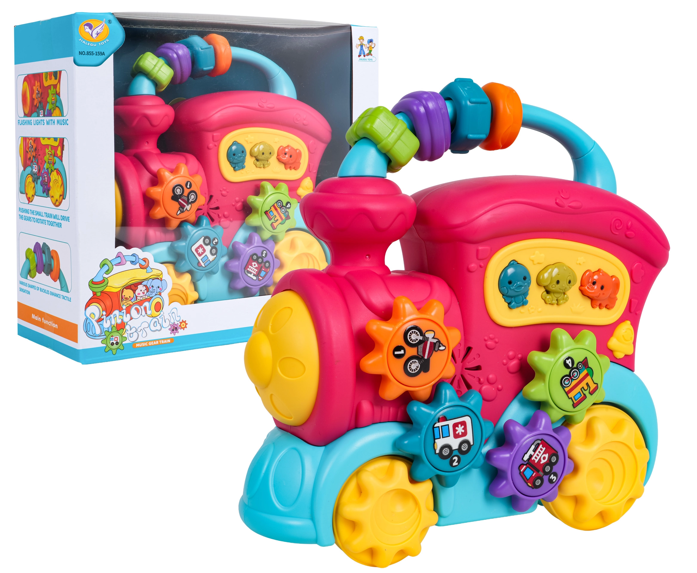 Šviečiantis žibintas, gyvūnų garsai, melodijos ir švelnus pavarų barškėjimas skatina jutiminį vystymąsi ir paverčia žaidimą smagia patirtimi.
