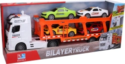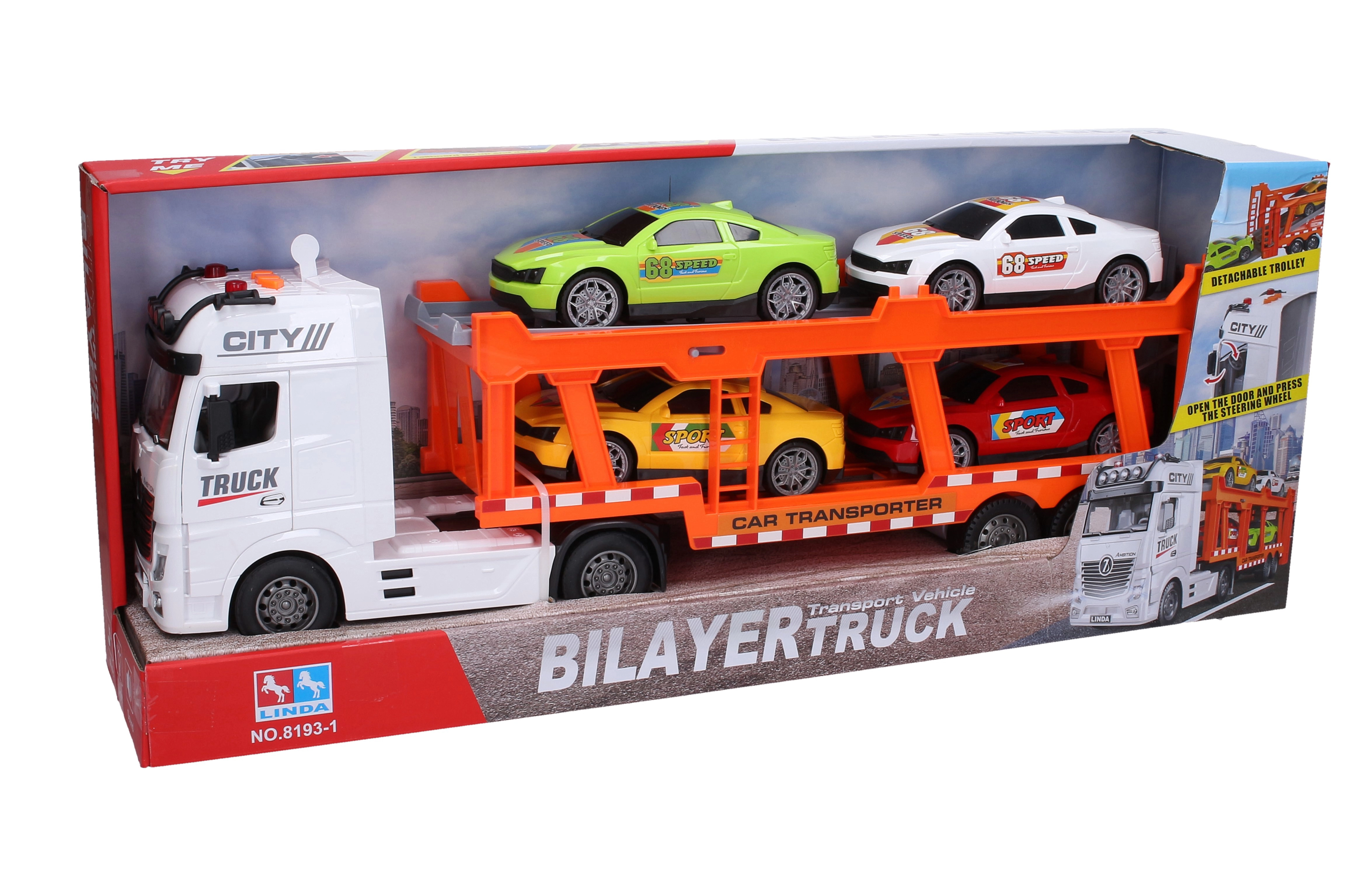 Didelis inercinis auto tralas, 56 cm ilgio, atveža net 4 stilingus automobilius ir pasirūpina daugybe pramogų dėl šviesos ir garso efektų. Įjungimas patogiai vyksta mygtukais ant stogo, yra variklio garsas, važiavimo atbulomis ir platformos judėjimo garsas. Į komplektą įeina baterijos, tad pramoga gali prasidėti iš karto.